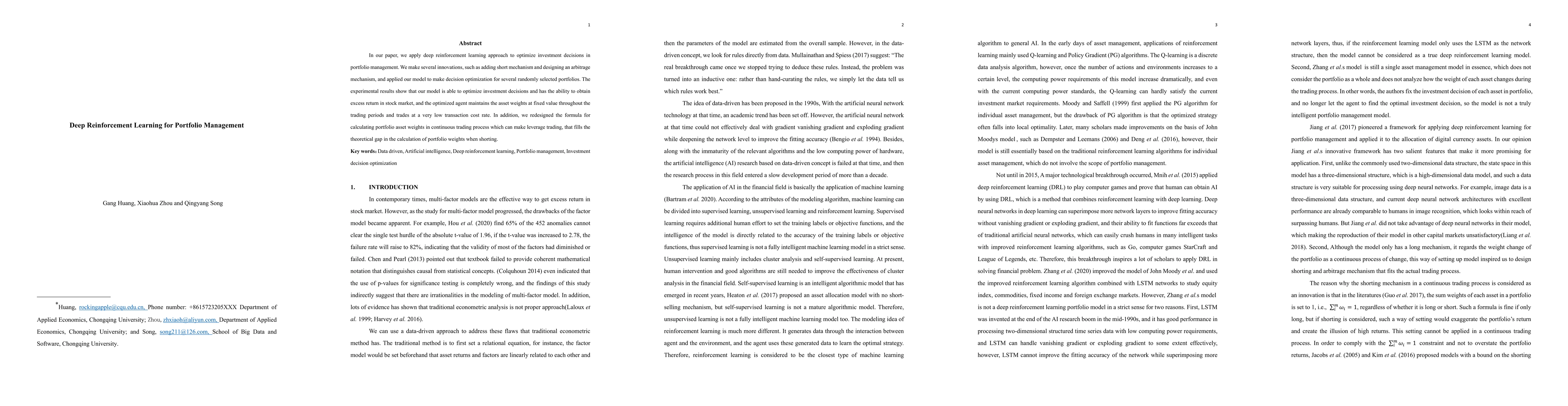This paper explores the application of deep reinforcement learning to optimize portfolio management decisions, incorporating innovations like a short mechanism and arbitrage mechanism. Experimental results demonstrate that the model effectively optimizes investment decisions, achieves excess returns, and maintains low transaction costs while filling a theoretical gap in portfolio weight calculations during shorting.