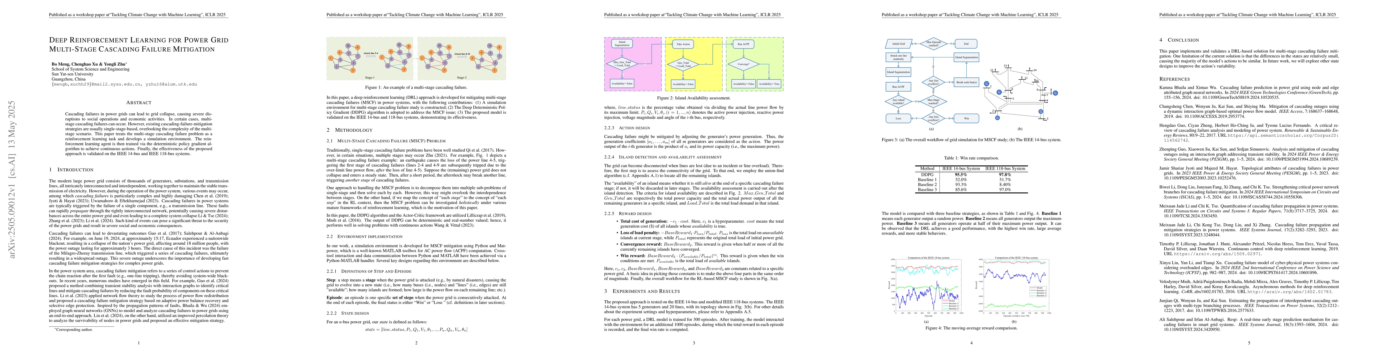 The paper develops a simulation environment for multi-stage cascading failure problem in power grids, then trains a reinforcement learning agent using the deterministic policy gradient algorithm for continuous actions.