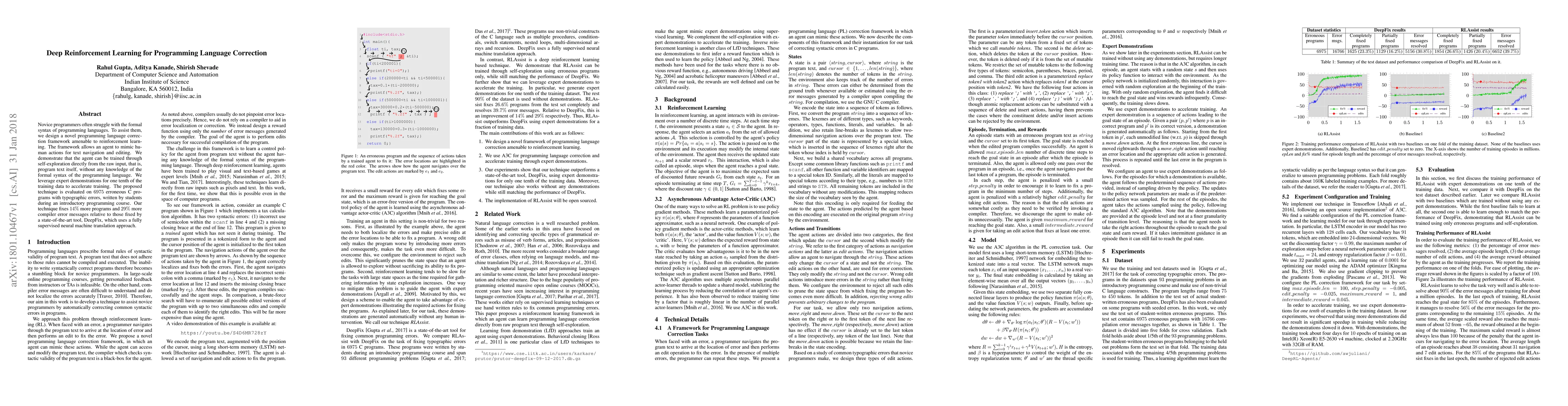 Novice programmers often struggle with the formal syntax of programming languages. To assist them, we design a novel programming language correction framework amenable to reinforcement learning. The framework allows an agent to mimic human actions for text navigation and editing. We demonstrate that the agent can be trained through self-exploration directly from the raw input, that is, program text itself, without any knowledge of the formal syntax of the programming language. We leverage expert demonstrations for one tenth of the training data to accelerate training. The proposed technique is evaluated on 6975 erroneous C programs with typographic errors, written by students during an introductory programming course. Our technique fixes 14% more programs and 29% more compiler error messages relative to those fixed by a state-of-the-art tool, DeepFix, which uses a fully supervised neural machine translation approach.