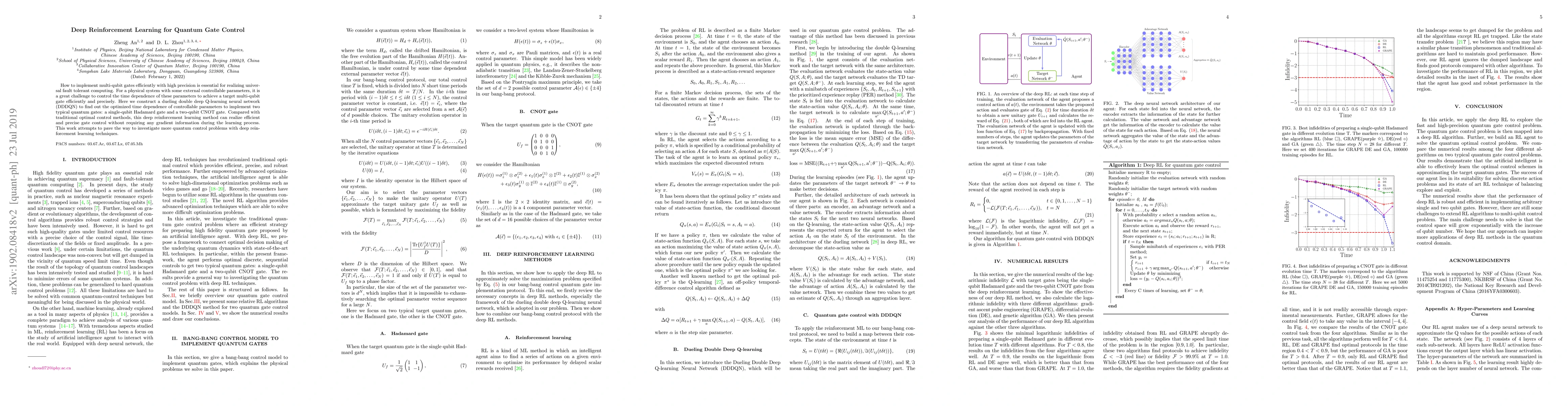 This paper proposes a dueling double deep Q-learning neural network (DDDQN) to optimize the control parameters for implementing precise multi-qubit quantum gates, specifically the Hadamard and CNOT gates, without requiring gradient information. This deep reinforcement learning approach offers an efficient alternative to traditional optimal control methods for quantum gate control.