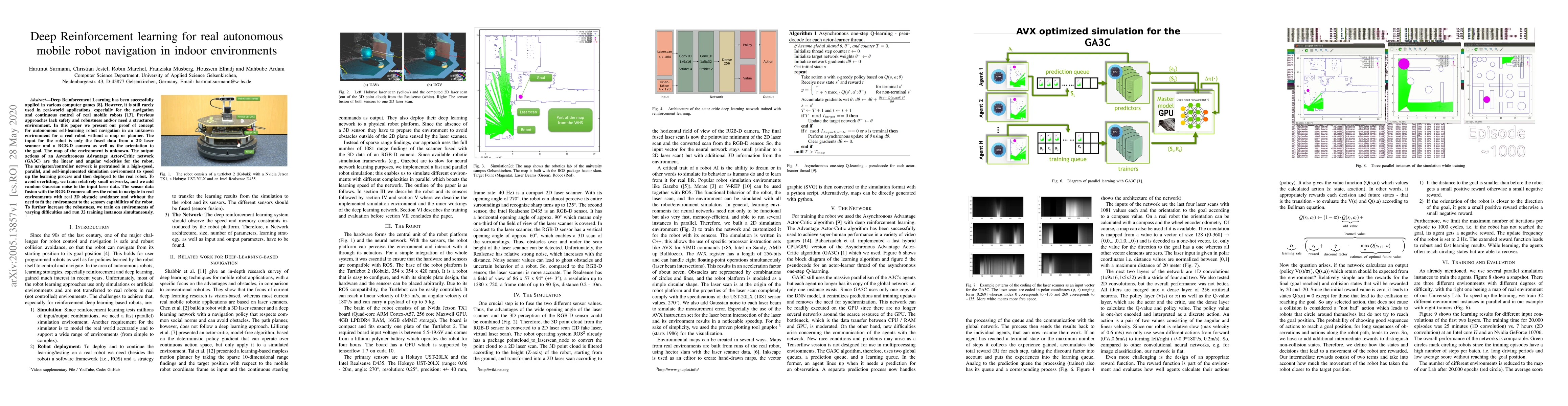 Deep Reinforcement Learning has been successfully applied in various computer games [8]. However, it is still rarely used in real-world applications, especially for the navigation and continuous control of real mobile robots [13]. Previous approaches lack safety and robustness and/or need a structured environment. In this paper we present our proof of concept for autonomous self-learning robot navigation in an unknown environment for a real robot without a map or planner. The input for the robot is only the fused data from a 2D laser scanner and a RGB-D camera as well as the orientation to the goal. The map of the environment is unknown. The output actions of an Asynchronous Advantage Actor-Critic network (GA3C) are the linear and angular velocities for the robot. The navigator/controller network is pretrained in a high-speed, parallel, and self-implemented simulation environment to speed up the learning process and then deployed to the real robot. To avoid overfitting, we train relatively small networks, and we add random Gaussian noise to the input laser data. The sensor data fusion with the RGB-D camera allows the robot to navigate in real environments with real 3D obstacle avoidance and without the need to fit the environment to the sensory capabilities of the robot. To further increase the robustness, we train on environments of varying difficulties and run 32 training instances simultaneously. Video: supplementary File / YouTube, Code: GitHub