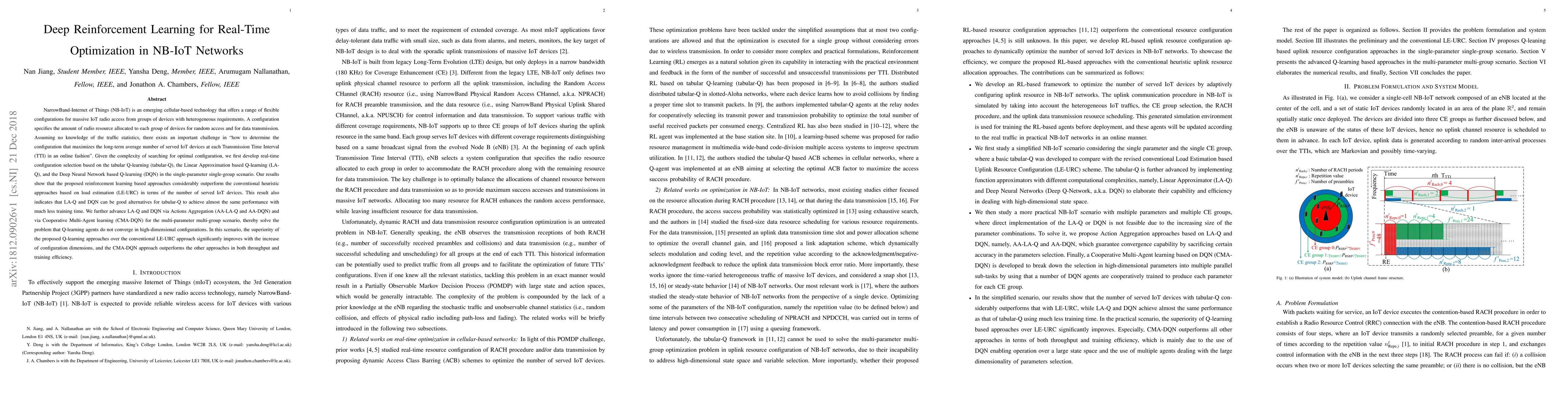 This paper develops real-time optimization methods for NB-IoT networks using reinforcement learning, outperforming traditional approaches in maximizing IoT device service numbers. The proposed methods, including LA-Q and DQN, improve performance and training efficiency with increased configuration dimensions.