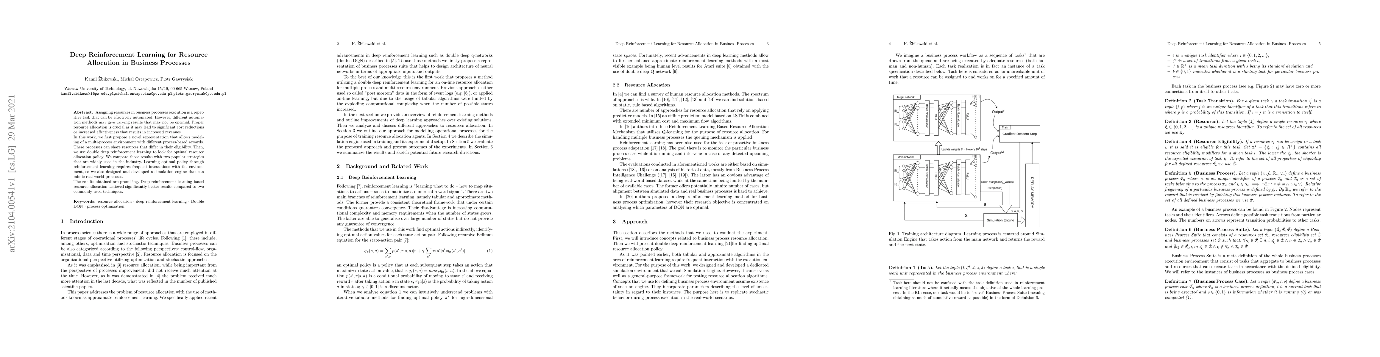This research proposes a deep reinforcement learning approach for optimal resource allocation in business processes, demonstrating significant improvements over traditional methods. A novel representation model is developed, and a simulation engine is created to facilitate training, resulting in superior performance in resource distribution.