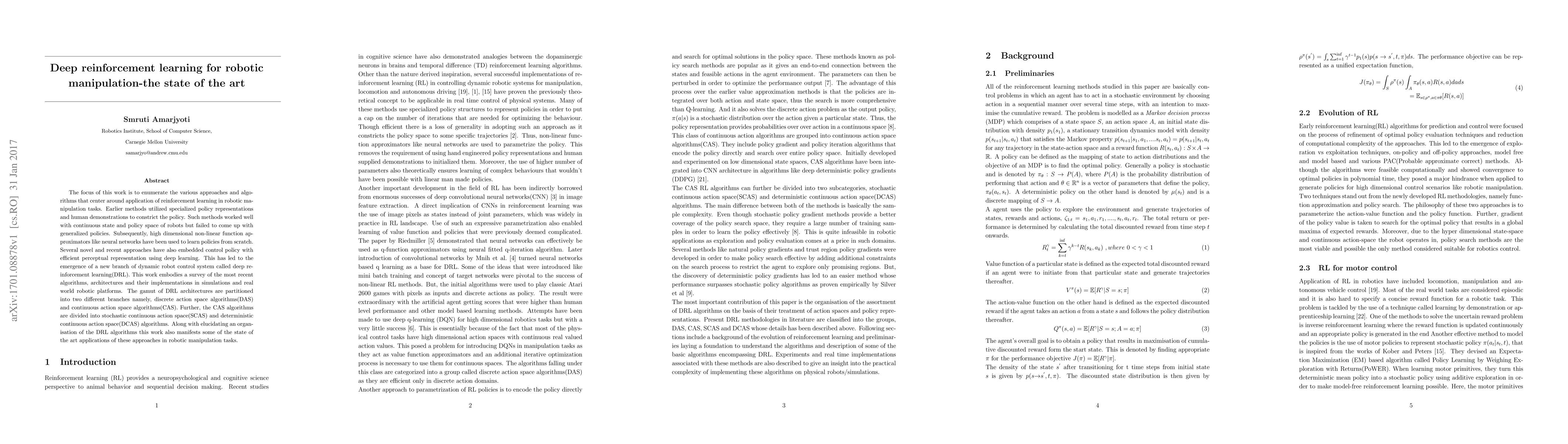 The focus of this work is to enumerate the various approaches and algorithms that center around application of reinforcement learning in robotic ma- ]]nipulation tasks. Earlier methods utilized specialized policy representations and human demonstrations to constrict the policy. Such methods worked well with continuous state and policy space of robots but failed to come up with generalized policies. Subsequently, high dimensional non-linear function approximators like neural networks have been used to learn policies from scratch. Several novel and recent approaches have also embedded control policy with efficient perceptual representation using deep learning. This has led to the emergence of a new branch of dynamic robot control system called deep r inforcement learning(DRL). This work embodies a survey of the most recent algorithms, architectures and their implementations in simulations and real world robotic platforms. The gamut of DRL architectures are partitioned into two different branches namely, discrete action space algorithms(DAS) and continuous action space algorithms(CAS). Further, the CAS algorithms are divided into stochastic continuous action space(SCAS) and deterministic continuous action space(DCAS) algorithms. Along with elucidating an organ- isation of the DRL algorithms this work also manifests some of the state of the art applications of these approaches in robotic manipulation tasks.