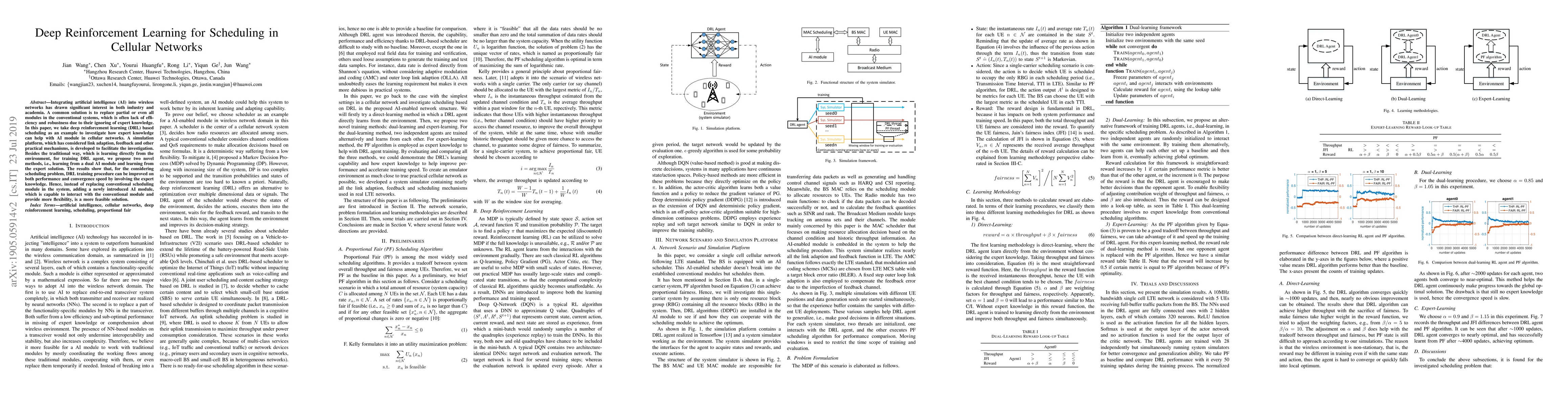 Researchers explored using deep reinforcement learning to improve scheduling in cellular networks by incorporating expert knowledge, achieving better performance and convergence speed. Adding a new AI module that interacts with the conventional system is proposed as a more feasible solution than replacing existing modules.