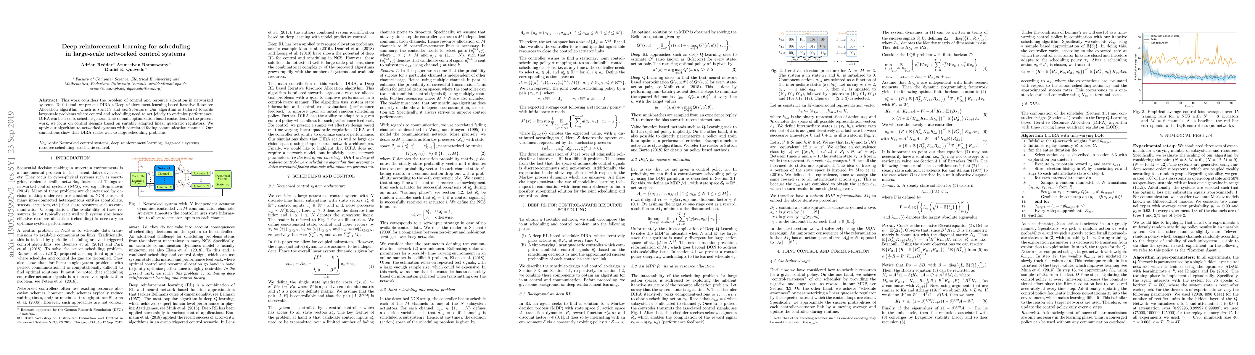This work considers the problem of control and resource scheduling in networked systems. We present DIRA, a Deep reinforcement learning based Iterative Resource Allocation algorithm, which is scalable and control-aware. Our algorithm is tailored towards large-scale problems where control and scheduling need to act jointly to optimize performance. DIRA can be used to schedule general time-domain optimization based controllers. In the present work, we focus on control designs based on suitably adapted linear quadratic regulators. We apply our algorithm to networked systems with correlated fading communication channels. Our simulations show that DIRA scales well to large scheduling problems.