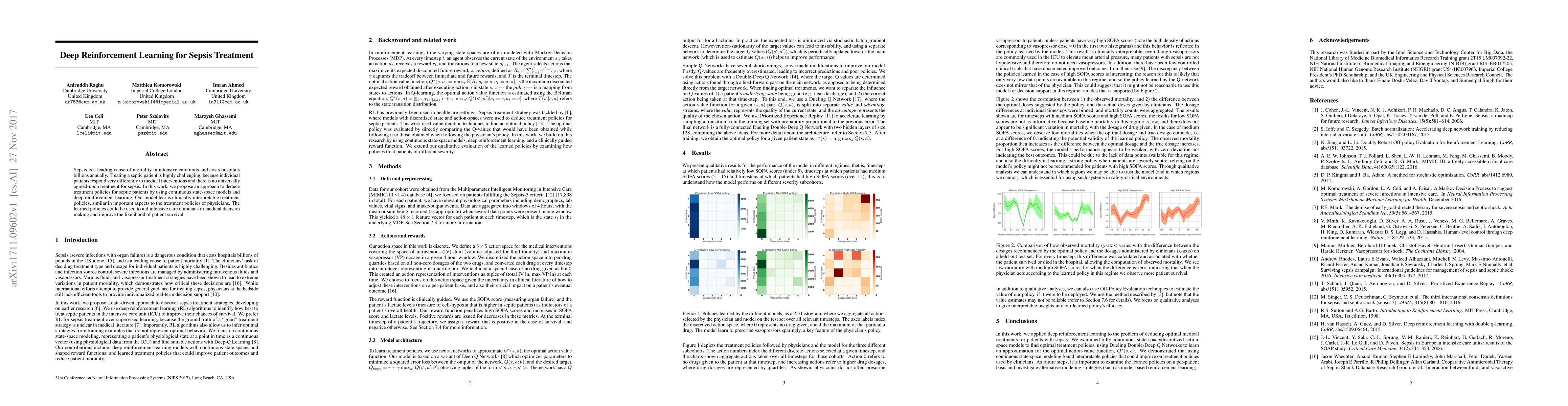 This paper proposes a deep reinforcement learning model to develop treatment policies for septic patients, aiming to improve patient survival by learning clinically interpretable strategies that mimic physician decision-making. The model uses continuous state-space models to address the variability in patient responses to medical interventions.