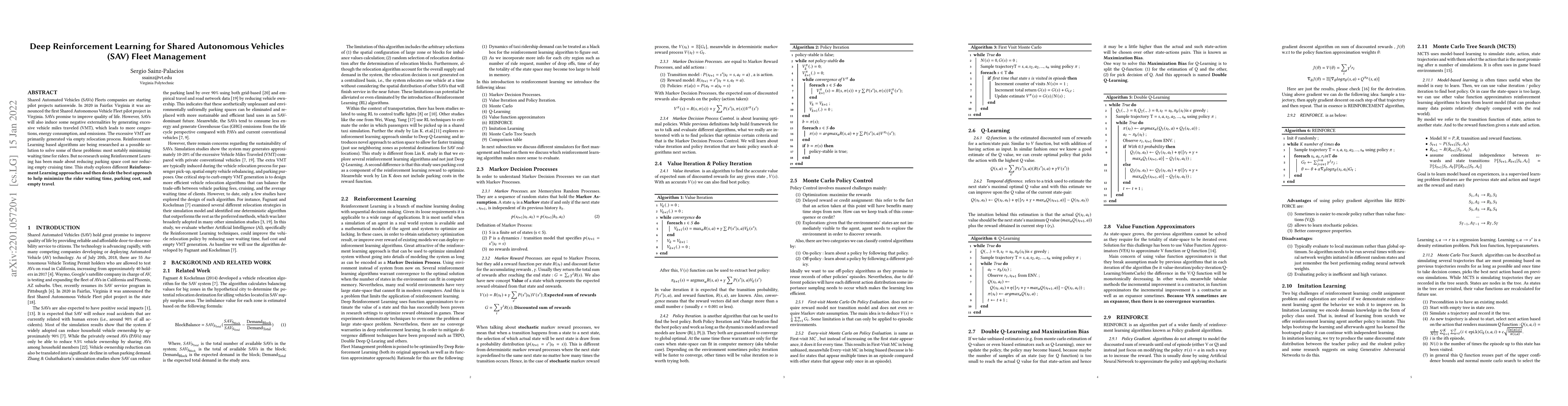 Shared Automated Vehicles (SAVs) Fleets companies are starting pilot projects nationwide. In 2020 in Fairfax Virginia it was announced the first Shared Autonomous Vehicle Fleet pilot project in Virginia. SAVs promise to improve quality of life. However, SAVs will also induce some negative externalities by generating excessive vehicle miles traveled (VMT), which leads to more congestions, energy consumption, and emissions. The excessive VMT are primarily generated via empty relocation process. Reinforcement Learning based algorithms are being researched as a possible solution to solve some of these problems: most notably minimizing waiting time for riders. But no research using Reinforcement Learning has been made about reducing parking space cost nor reducing empty cruising time. This study explores different \textbf{Reinforcement Learning approaches and then decide the best approach to help minimize the rider waiting time, parking cost, and empty travel