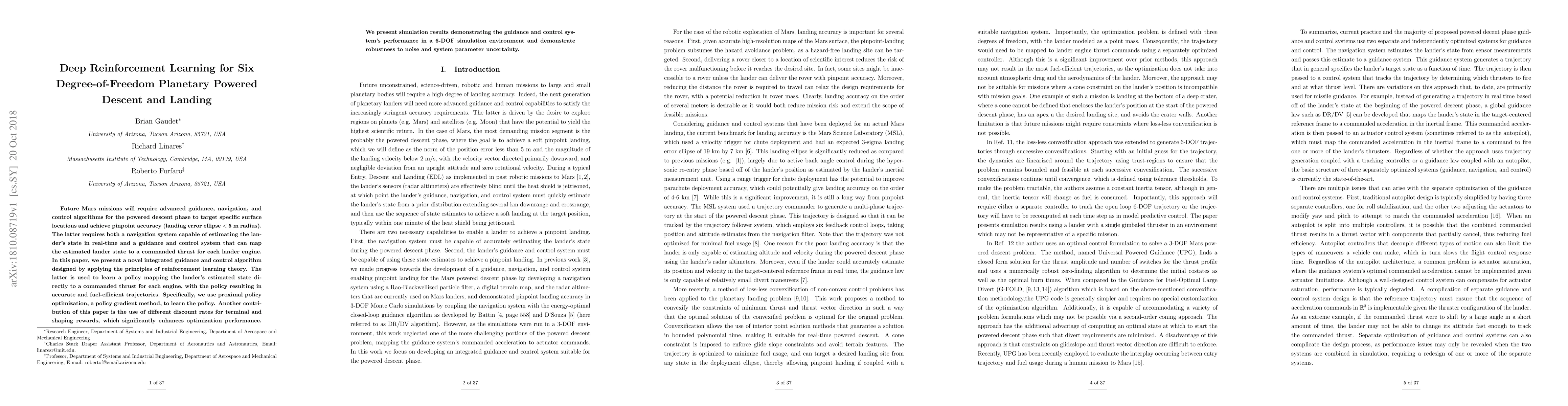 This paper proposes a deep reinforcement learning algorithm for Mars lander powered descent, using proximal policy optimization to achieve precise landing within a 5 m radius. The method incorporates different discount rates for rewards, enhancing performance and demonstrating robustness in a 6-DOF simulation environment.