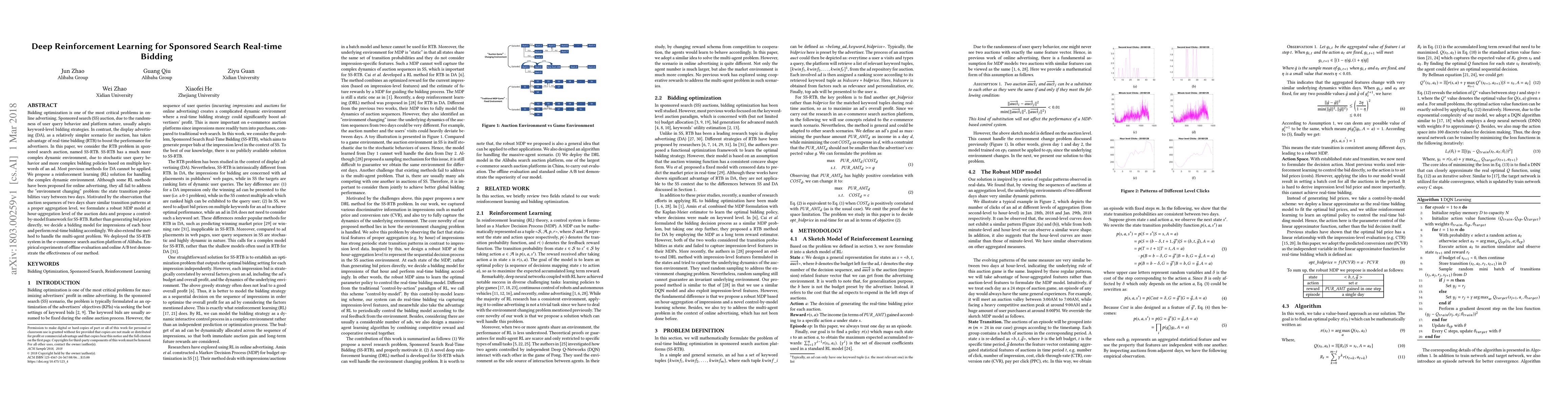 This paper proposes a reinforcement learning approach to optimize real-time bidding in sponsored search auctions, addressing the dynamic and complex environment of stochastic user queries and multi-keyword bidding strategies. The method formulates a robust MDP model at an hour-aggregation level and employs a control-by-model framework to decide bidding models for each hour, demonstrating effectiveness through offline evaluation and online A/B tests on Alibaba's e-commerce platform.