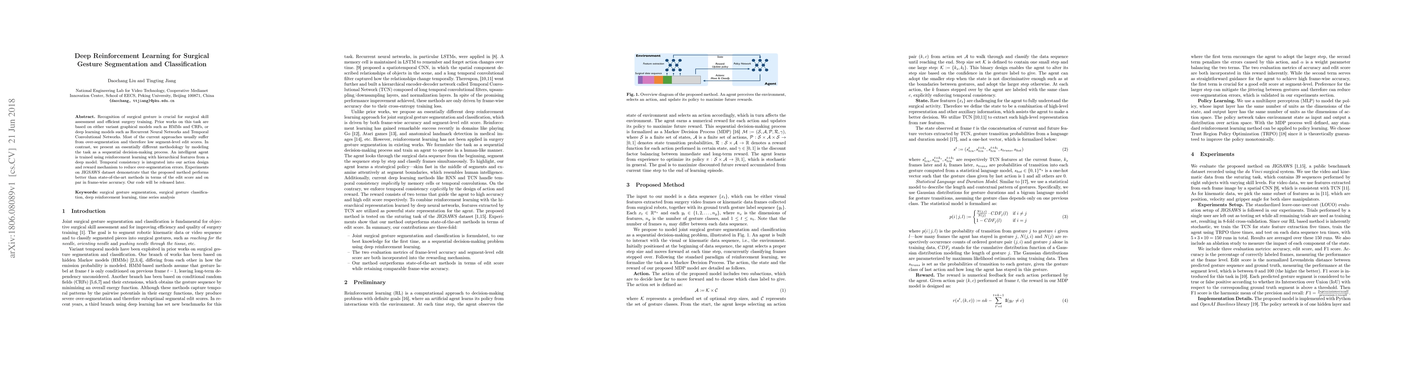 This paper proposes a deep reinforcement learning approach for surgical gesture segmentation and classification, addressing over-segmentation issues with a sequential decision-making process. The method outperforms existing techniques in segment-level edit scores while maintaining frame-wise accuracy, as demonstrated on the JIGSAWS dataset.