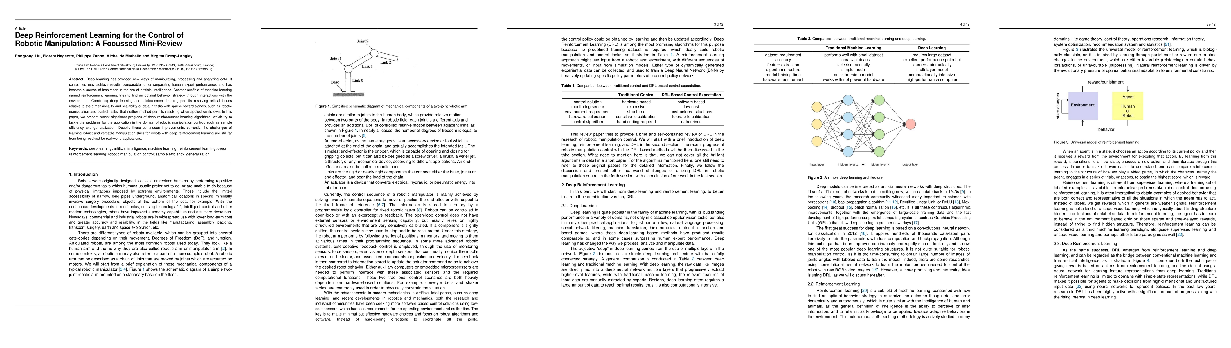 This paper reviews advancements in deep reinforcement learning for robotic manipulation, highlighting how the combination resolves challenges in dimensionality and scalability, though robust and versatile skill learning for real-world applications remains unresolved.