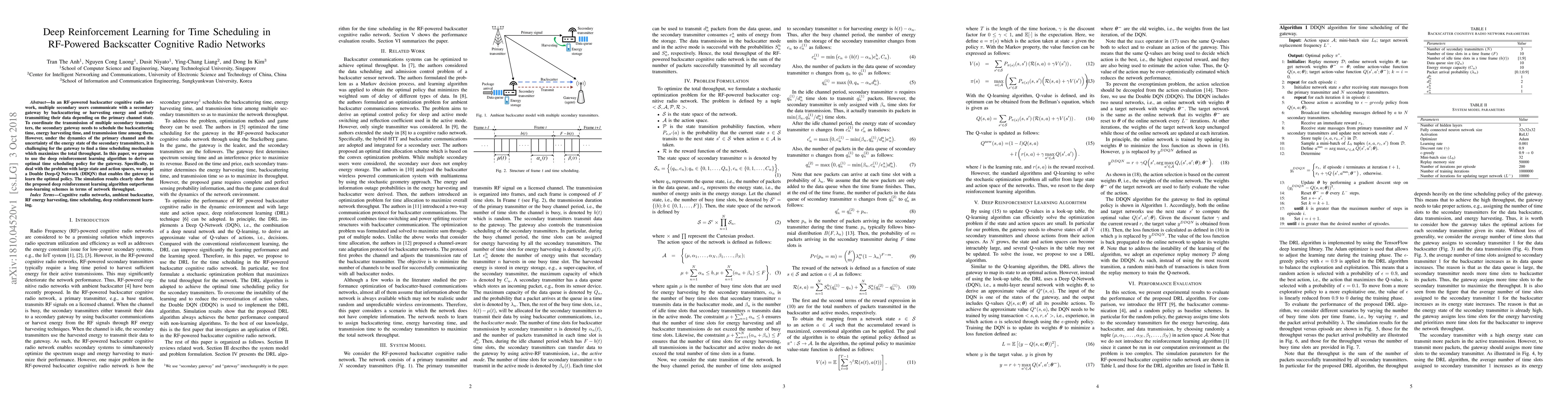 This paper proposes a deep reinforcement learning approach using Double Deep-Q Networks (DDQN) to optimize time scheduling in RF-powered backscatter cognitive radio networks. The proposed method effectively handles large state and action spaces, significantly improving network throughput compared to non-learning schemes.