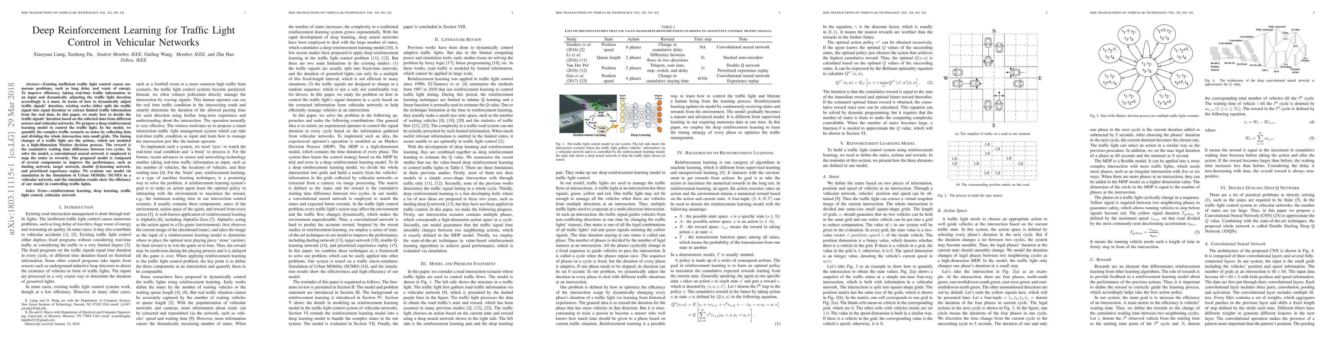 This paper proposes a deep reinforcement learning model to dynamically adjust traffic light durations based on real-time traffic data from vehicular networks, aiming to reduce delays and energy waste. The model uses a convolutional neural network to map complex traffic scenarios into optimal actions, demonstrating improved efficiency through simulations in SUMO.