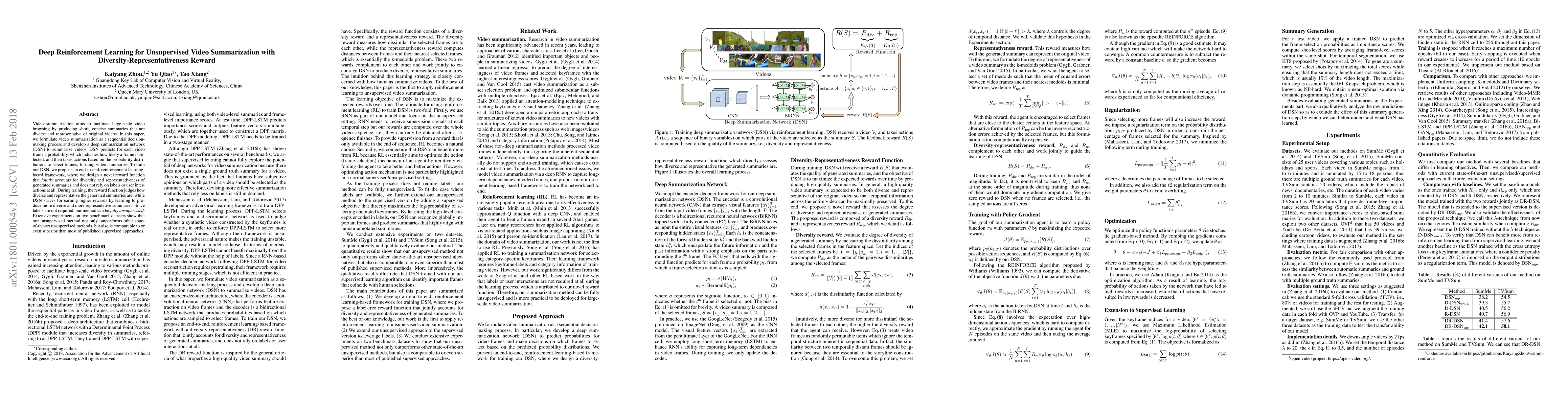 This paper presents a deep reinforcement learning framework for unsupervised video summarization that selects frames to create diverse and representative video summaries without requiring labels. The proposed deep summarization network (DSN) uses a reward function that encourages diversity and representativeness, leading to superior performance compared to both unsupervised and supervised baselines.