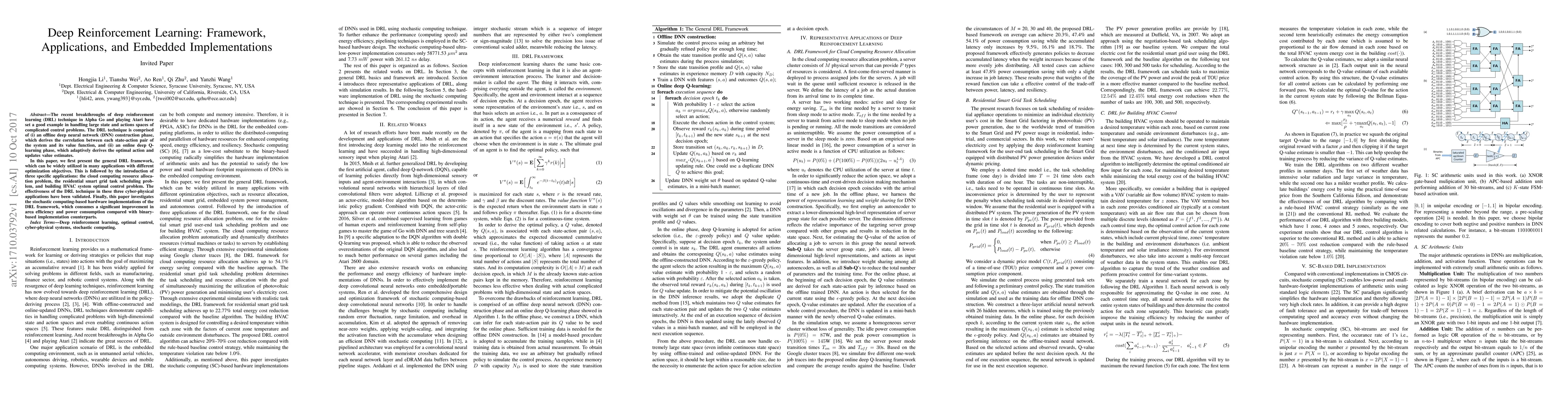 This paper outlines the deep reinforcement learning (DRL) framework, detailing its offline neural network construction and online deep Q-learning phases. It explores DRL applications in cloud computing, smart grid scheduling, and HVAC system control, demonstrating its effectiveness, and examines its hardware implementations using stochastic computing for improved efficiency.