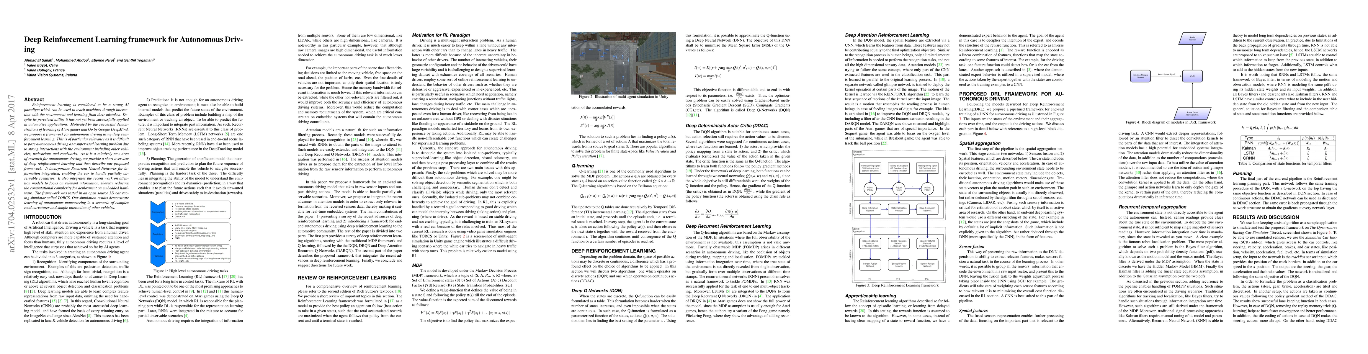 This research proposes a deep reinforcement learning framework for autonomous driving, incorporating Recurrent Neural Networks and attention models to manage partially observable environments and reduce computational demands. Tested in a 3D car racing simulator, the framework successfully learns to navigate complex road conditions and interactions with other vehicles.