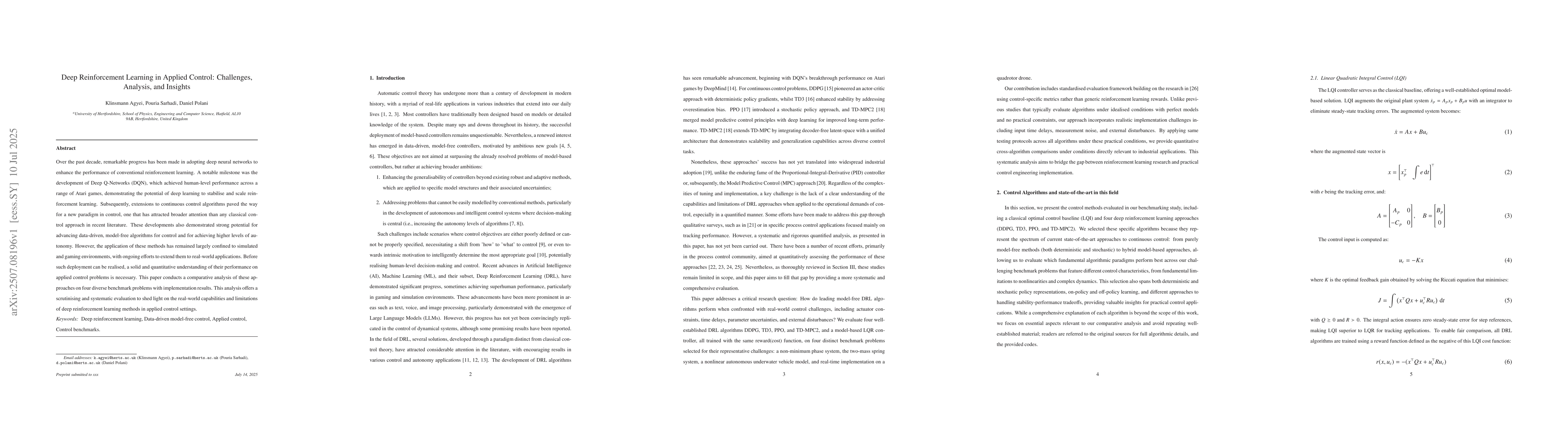 Over the past decade, remarkable progress has been made in adopting deep neural networks to enhance the performance of conventional reinforcement learning. A notable milestone was the development of Deep Q-Networks (DQN), which achieved human-level performance across a range of Atari games, demonstrating the potential of deep learning to stabilise and scale reinforcement learning. Subsequently, extensions to continuous control algorithms paved the way for a new paradigm in control, one that has attracted broader attention than any classical control approach in recent literature. These developments also demonstrated strong potential for advancing data-driven, model-free algorithms for control and for achieving higher levels of autonomy. However, the application of these methods has remained largely confined to simulated and gaming environments, with ongoing efforts to extend them to real-world applications. Before such deployment can be realised, a solid and quantitative understanding of their performance on applied control problems is necessary. This paper conducts a comparative analysis of these approaches on four diverse benchmark problems with implementation results. This analysis offers a scrutinising and systematic evaluation to shed light on the real-world capabilities and limitations of deep reinforcement learning methods in applied control settings.