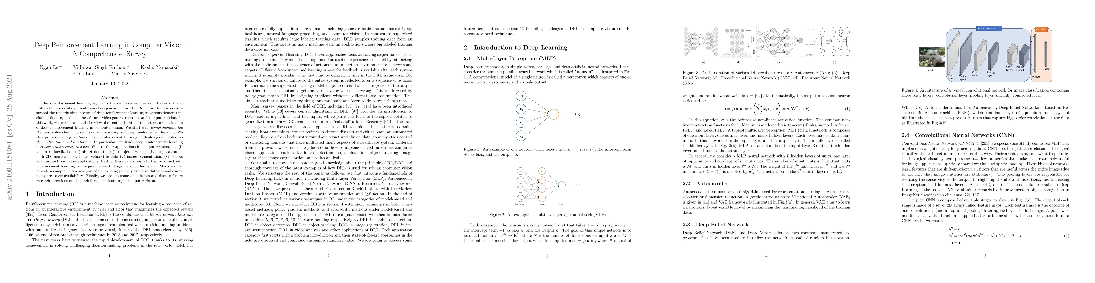 This paper provides a comprehensive review of deep reinforcement learning in computer vision, categorizing methodologies into seven application areas and analyzing their techniques, network designs, and performance. It also examines available datasets and source code, and discusses future research directions.