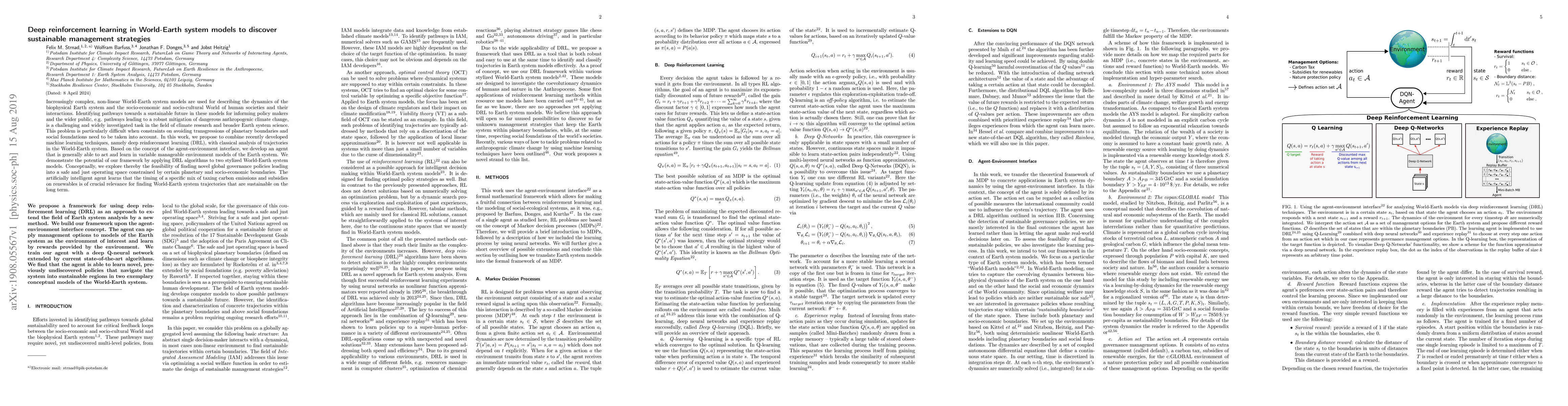 Increasingly complex, non-linear World-Earth system models are used for describing the dynamics of the biophysical Earth system and the socio-economic and socio-cultural World of human societies and their interactions. Identifying pathways towards a sustainable future in these models for informing policy makers and the wider public, e.g. pathways leading to a robust mitigation of dangerous anthropogenic climate change, is a challenging and widely investigated task in the field of climate research and broader Earth system science. This problem is particularly difficult when constraints on avoiding transgressions of planetary boundaries and social foundations need to be taken into account. In this work, we propose to combine recently developed machine learning techniques, namely deep reinforcement learning (DRL), with classical analysis of trajectories in the World-Earth system. Based on the concept of the agent-environment interface, we develop an agent that is generally able to act and learn in variable manageable environment models of the Earth system. We demonstrate the potential of our framework by applying DRL algorithms to two stylized World-Earth system models. Conceptually, we explore thereby the feasibility of finding novel global governance policies leading into a safe and just operating space constrained by certain planetary and socio-economic boundaries. The artificially intelligent agent learns that the timing of a specific mix of taxing carbon emissions and subsidies on renewables is of crucial relevance for finding World-Earth system trajectories that are sustainable on the long term.
