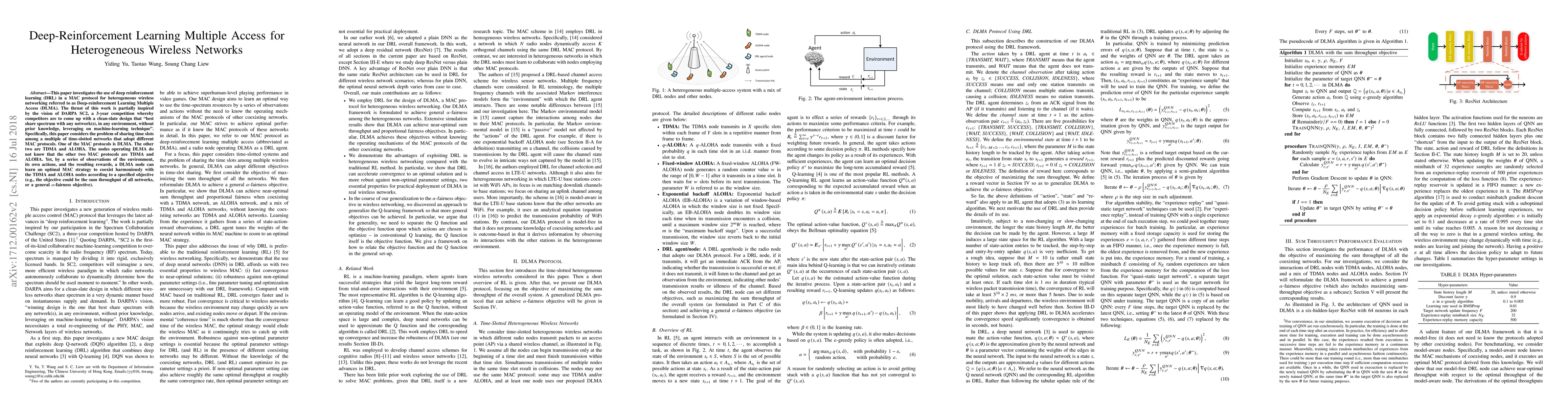 This paper explores deep reinforcement learning (DRL) for a MAC protocol called Deep-reinforcement Learning Multiple Access (DLMA) in heterogeneous wireless networks. DLMA learns optimal coexistence strategies with other networks like TDMA and ALOHA through environmental observations and rewards, aiming for objectives like sum throughput or fairness.