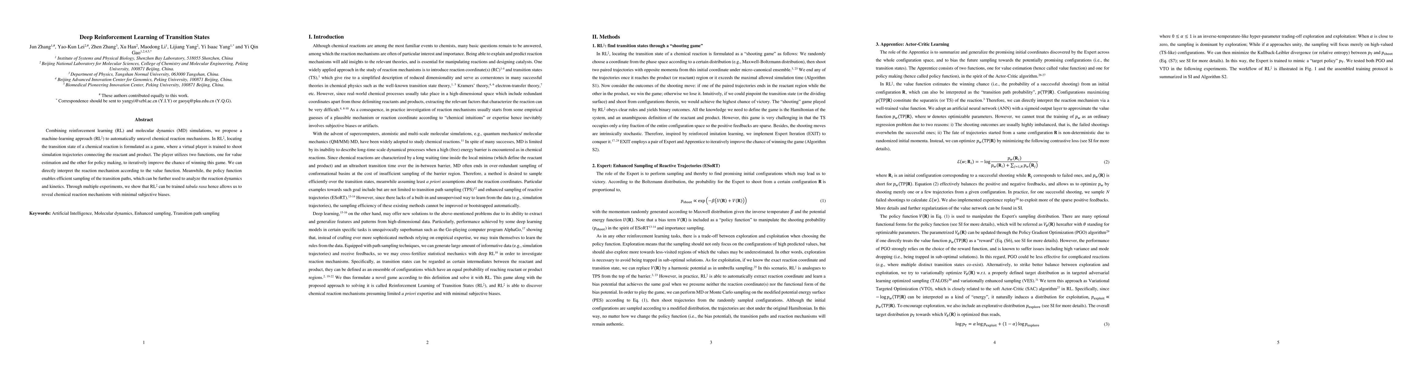 This paper proposes a reinforcement learning approach, RL$^\ddag$, combining molecular dynamics simulations to automatically uncover chemical reaction mechanisms by training a virtual player to identify transition states. The method uses value and policy functions to iteratively improve the discovery of reaction pathways, revealing mechanisms with minimal bias.