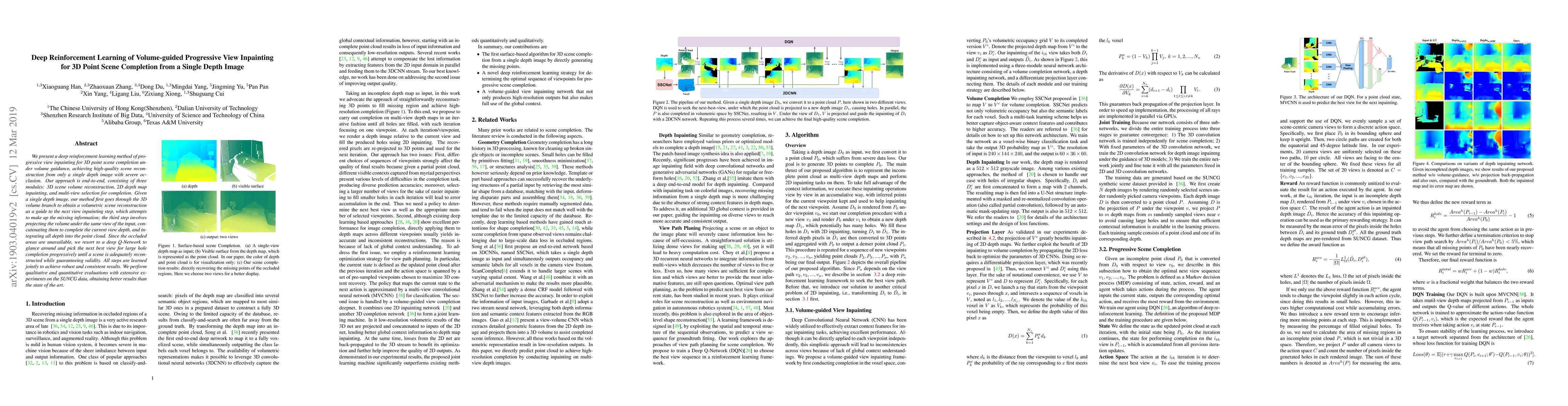 This paper proposes a deep reinforcement learning method for 3D point scene completion from a single depth image, utilizing progressive view inpainting guided by a 3D volume reconstruction. The approach combines 3D volume reconstruction, 2D depth map inpainting, and multi-view selection, achieving high-quality reconstructions even with severe occlusions.