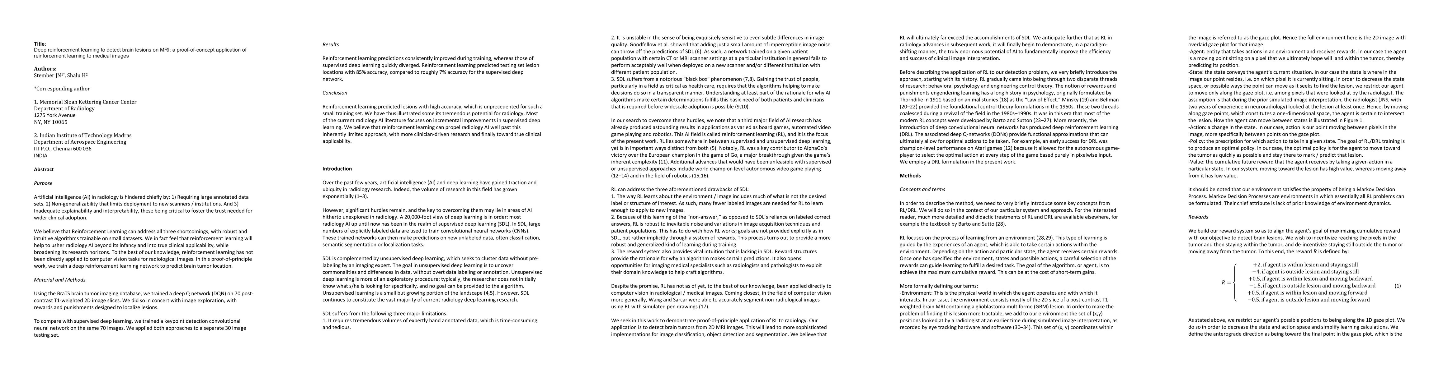 Purpose: AI in radiology is hindered chiefly by: 1) Requiring large annotated data sets. 2) Non-generalizability that limits deployment to new scanners / institutions. And 3) Inadequate explainability and interpretability. We believe that reinforcement learning can address all three shortcomings, with robust and intuitive algorithms trainable on small datasets. To the best of our knowledge, reinforcement learning has not been directly applied to computer vision tasks for radiological images. In this proof-of-principle work, we train a deep reinforcement learning network to predict brain tumor location. Materials and Methods: Using the BraTS brain tumor imaging database, we trained a deep Q network on 70 post-contrast T1-weighted 2D image slices. We did so in concert with image exploration, with rewards and punishments designed to localize lesions. To compare with supervised deep learning, we trained a keypoint detection convolutional neural network on the same 70 images. We applied both approaches to a separate 30 image testing set. Results: Reinforcement learning predictions consistently improved during training, whereas those of supervised deep learning quickly diverged. Reinforcement learning predicted testing set lesion locations with 85% accuracy, compared to roughly 7% accuracy for the supervised deep network. Conclusion: Reinforcement learning predicted lesions with high accuracy, which is unprecedented for such a small training set. We believe that reinforcement learning can propel radiology AI well past the inherent limitations of supervised deep learning, with more clinician-driven research and finally toward true clinical applicability.