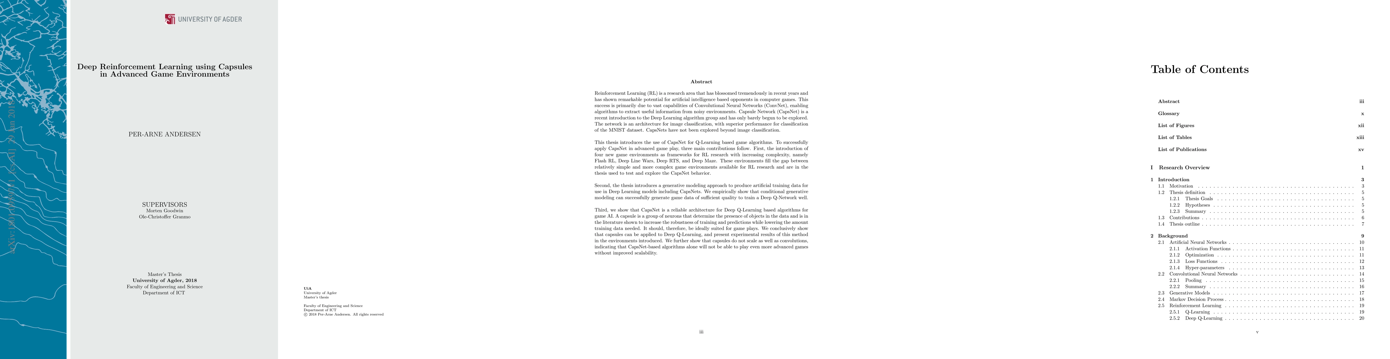 Reinforcement Learning (RL) is a research area that has blossomed tremendously in recent years and has shown remarkable potential for artificial intelligence based opponents in computer games. This success is primarily due to vast capabilities of Convolutional Neural Networks (ConvNet), enabling algorithms to extract useful information from noisy environments. Capsule Network (CapsNet) is a recent introduction to the Deep Learning algorithm group and has only barely begun to be explored. The network is an architecture for image classification, with superior performance for classification of the MNIST dataset. CapsNets have not been explored beyond image classification. This thesis introduces the use of CapsNet for Q-Learning based game algorithms. To successfully apply CapsNet in advanced game play, three main contributions follow. First, the introduction of four new game environments as frameworks for RL research with increasing complexity, namely Flash RL, Deep Line Wars, Deep RTS, and Deep Maze. These environments fill the gap between relatively simple and more complex game environments available for RL research and are in the thesis used to test and explore the CapsNet behavior. Second, the thesis introduces a generative modeling approach to produce artificial training data for use in Deep Learning models including CapsNets. We empirically show that conditional generative modeling can successfully generate game data of sufficient quality to train a Deep Q-Network well. Third, we show that CapsNet is a reliable architecture for Deep Q-Learning based algorithms for game AI. A capsule is a group of neurons that determine the presence of objects in the data and is in the literature shown to increase the robustness of training and predictions while lowering the amount training data needed. It should, therefore, be ideally suited for game plays.