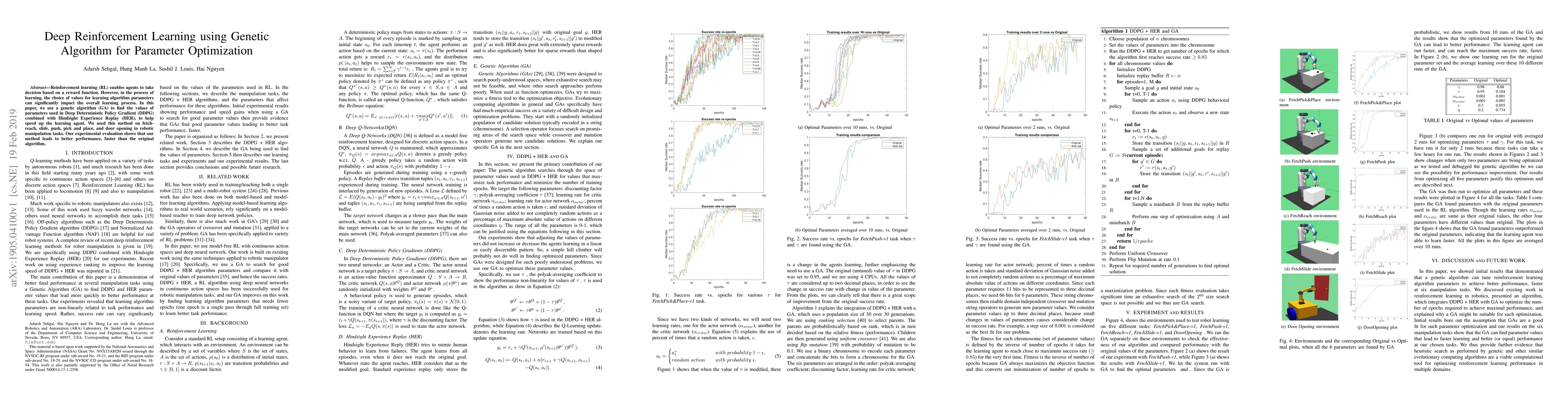 This paper employs a genetic algorithm to optimize parameters for Deep Deterministic Policy Gradient combined with Hindsight Experience Replay, enhancing learning speed in robotic manipulation tasks. The method demonstrates superior performance compared to the original algorithm.