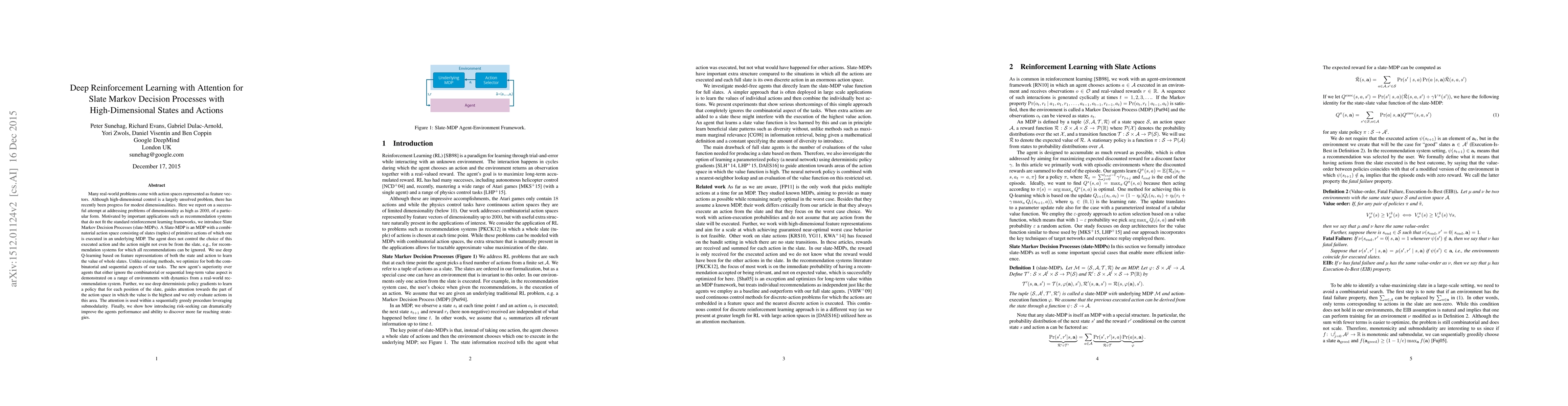 Many real-world problems come with action spaces represented as feature vectors. Although high-dimensional control is a largely unsolved problem, there has recently been progress for modest dimensionalities. Here we report on a successful attempt at addressing problems of dimensionality as high as $2000$, of a particular form. Motivated by important applications such as recommendation systems that do not fit the standard reinforcement learning frameworks, we introduce Slate Markov Decision Processes (slate-MDPs). A Slate-MDP is an MDP with a combinatorial action space consisting of slates (tuples) of primitive actions of which one is executed in an underlying MDP. The agent does not control the choice of this executed action and the action might not even be from the slate, e.g., for recommendation systems for which all recommendations can be ignored. We use deep Q-learning based on feature representations of both the state and action to learn the value of whole slates. Unlike existing methods, we optimize for both the combinatorial and sequential aspects of our tasks. The new agent's superiority over agents that either ignore the combinatorial or sequential long-term value aspect is demonstrated on a range of environments with dynamics from a real-world recommendation system. Further, we use deep deterministic policy gradients to learn a policy that for each position of the slate, guides attention towards the part of the action space in which the value is the highest and we only evaluate actions in this area. The attention is used within a sequentially greedy procedure leveraging submodularity. Finally, we show how introducing risk-seeking can dramatically improve the agents performance and ability to discover more far reaching strategies.