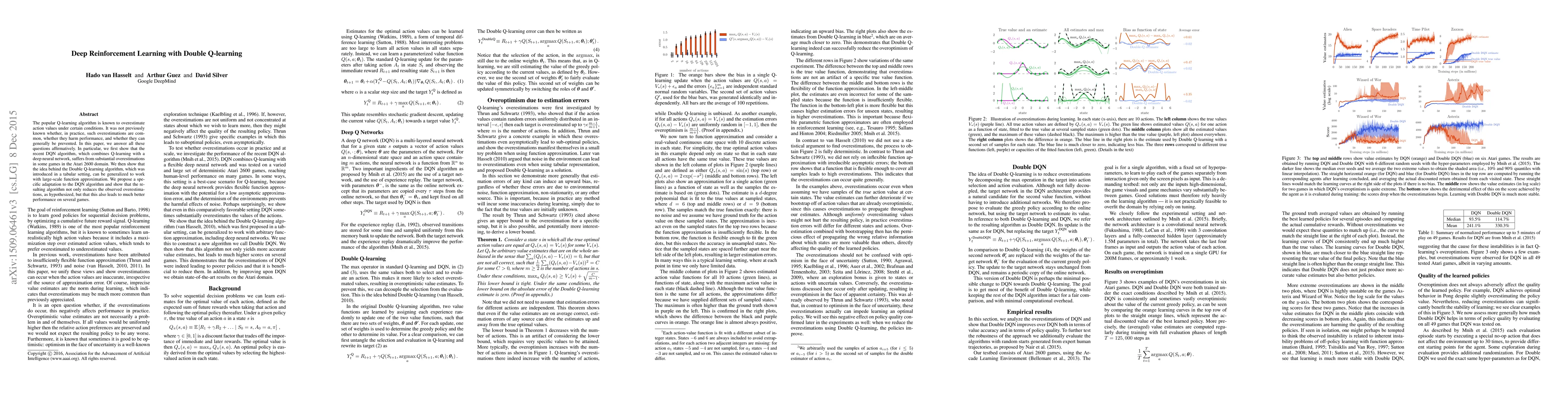 The popular Q-learning algorithm is known to overestimate action values under certain conditions. It was not previously known whether, in practice, such overestimations are common, whether they harm performance, and whether they can generally be prevented. In this paper, we answer all these questions affirmatively. In particular, we first show that the recent DQN algorithm, which combines Q-learning with a deep neural network, suffers from substantial overestimations in some games in the Atari 2600 domain. We then show that the idea behind the Double Q-learning algorithm, which was introduced in a tabular setting, can be generalized to work with large-scale function approximation. We propose a specific adaptation to the DQN algorithm and show that the resulting algorithm not only reduces the observed overestimations, as hypothesized, but that this also leads to much better performance on several games.