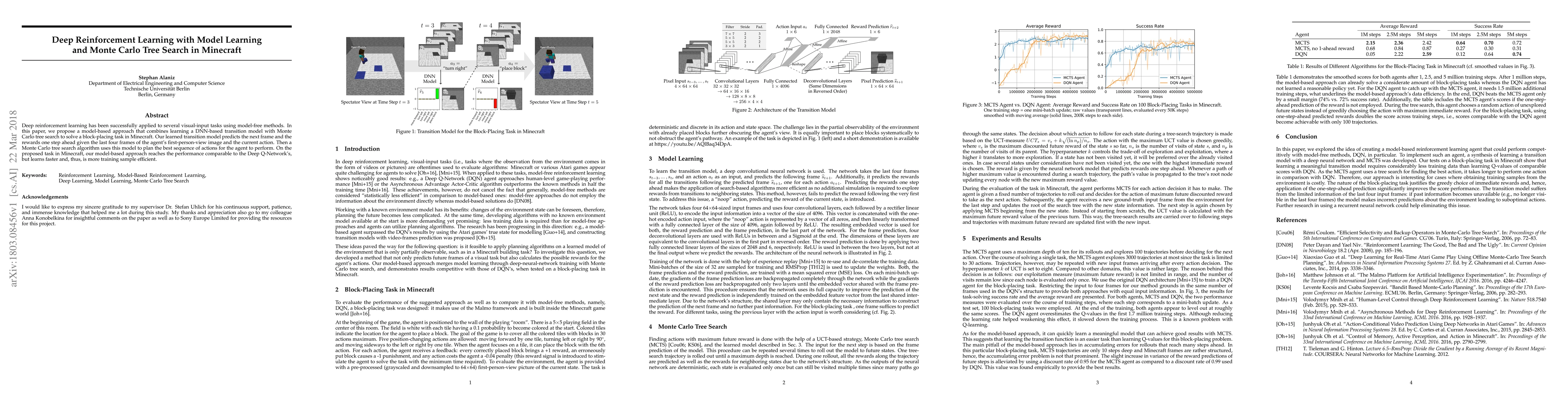 This paper proposes a model-based deep reinforcement learning approach combining a DNN-based transition model with Monte Carlo tree search to solve a block-placing task in Minecraft. The model learns to predict future frames and rewards, enabling faster learning and higher sample efficiency compared to model-free methods.