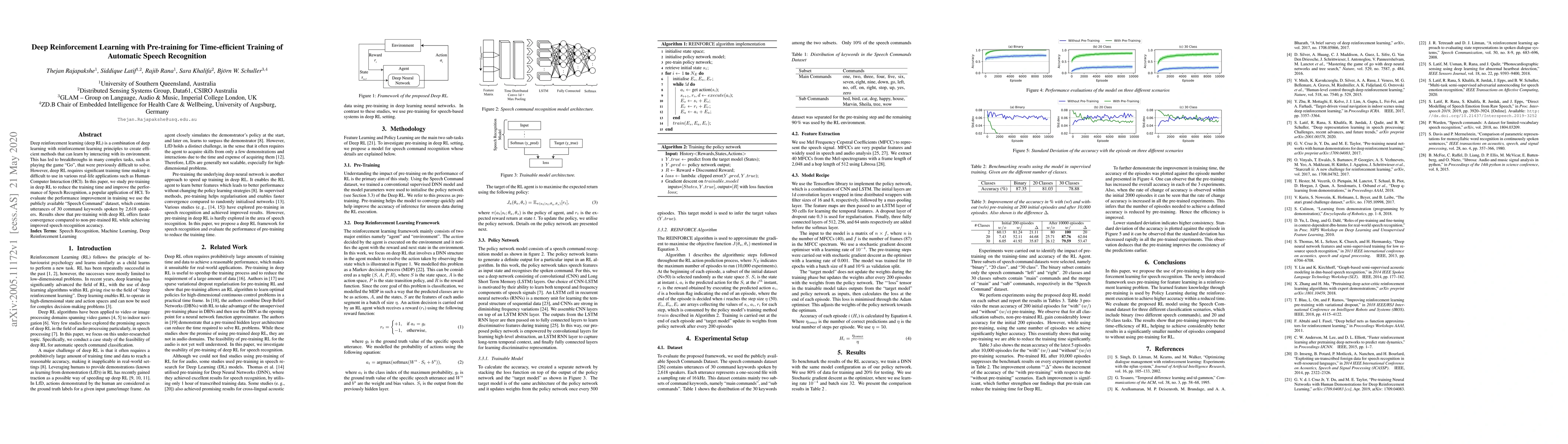 This paper explores the use of pre-training in deep reinforcement learning to expedite the training process for automatic speech recognition, demonstrating faster convergence and improved accuracy on the "Speech Command" dataset compared to non-pre-trained methods.