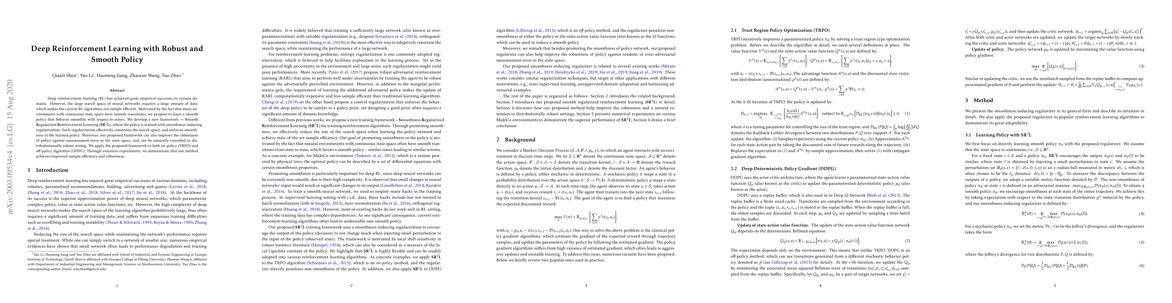 This paper introduces a novel deep reinforcement learning framework called Smooth Regularized Reinforcement Learning (SR²L) that enhances sample efficiency and robustness by learning a smooth policy through regularization. The proposed method effectively constrains the neural network's search space and improves the policy's robustness against measurement errors, demonstrating improved performance in both on-policy and off-policy algorithms.