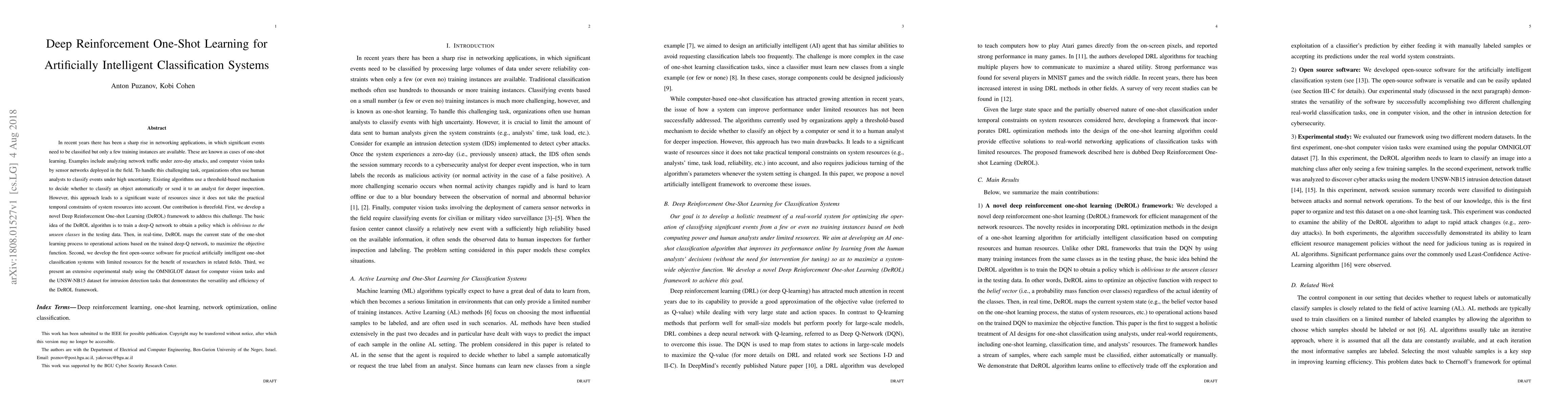 In recent years there has been a sharp rise in networking applications, in which significant events need to be classified but only a few training instances are available. These are known as cases of one-shot learning. Examples include analyzing network traffic under zero-day attacks, and computer vision tasks by sensor networks deployed in the field. To handle this challenging task, organizations often use human analysts to classify events under high uncertainty. Existing algorithms use a threshold-based mechanism to decide whether to classify an object automatically or send it to an analyst for deeper inspection. However, this approach leads to a significant waste of resources since it does not take the practical temporal constraints of system resources into account. Our contribution is threefold. First, we develop a novel Deep Reinforcement One-shot Learning (DeROL) framework to address this challenge. The basic idea of the DeROL algorithm is to train a deep-Q network to obtain a policy which is oblivious to the unseen classes in the testing data. Then, in real-time, DeROL maps the current state of the one-shot learning process to operational actions based on the trained deep-Q network, to maximize the objective function. Second, we develop the first open-source software for practical artificially intelligent one-shot classification systems with limited resources for the benefit of researchers in related fields. Third, we present an extensive experimental study using the OMNIGLOT dataset for computer vision tasks and the UNSW-NB15 dataset for intrusion detection tasks that demonstrates the versatility and efficiency of the DeROL framework.