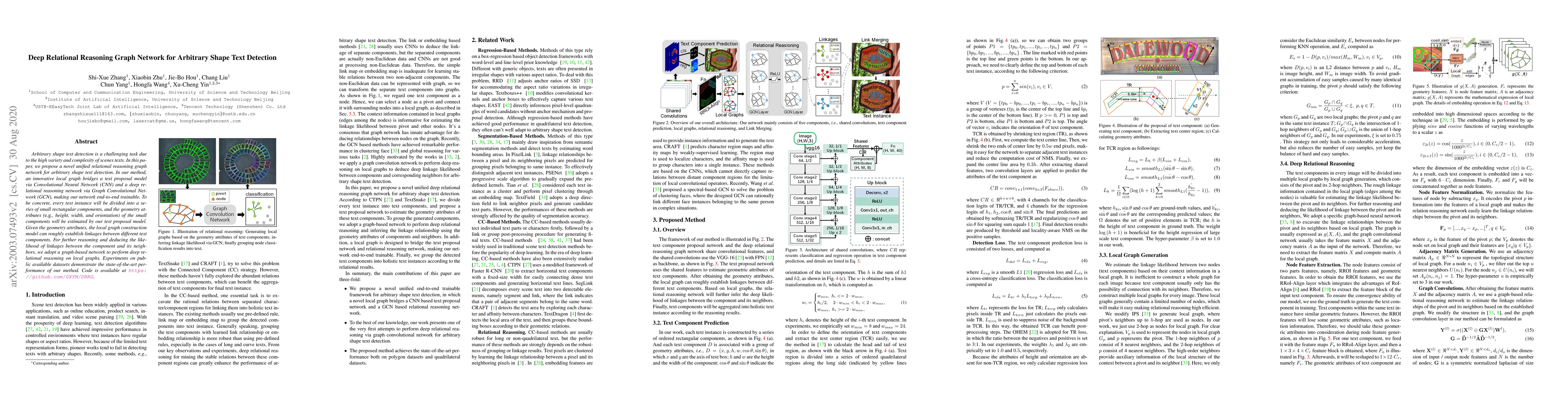 This paper proposes a Deep Relational Reasoning Graph Network to detect arbitrary shape text by integrating a CNN-based text proposal model with a GCN for deep relational reasoning. The method divides text into small components and establishes linkages between them for enhanced detection accuracy, achieving state-of-the-art results in experiments.