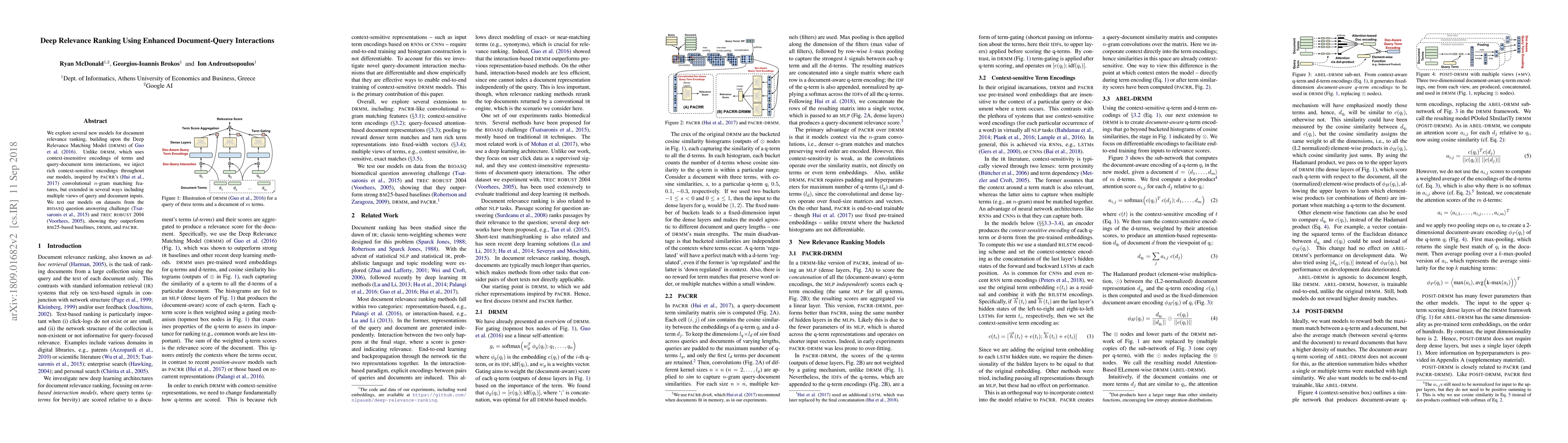 This paper proposes enhanced document relevance ranking models that incorporate context-sensitive encodings, surpassing the Deep Relevance Matching Model (DRMM) and convolutional n-gram matching features. The new models achieve superior performance on the BIOASQ and TREC ROBUST 2004 datasets compared to BM25 and DRMM baselines.