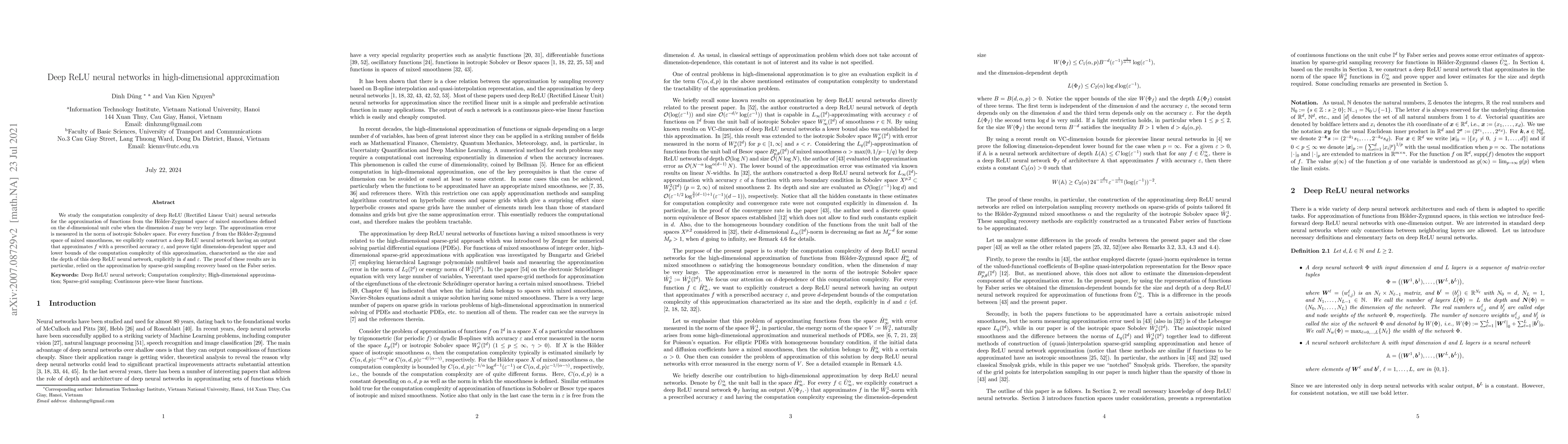 This paper investigates the computational complexity of deep ReLU neural networks for approximating functions with mixed smoothness in high dimensions, providing explicit constructions and tight bounds on the network size and depth. The results are derived using sparse-grid sampling recovery based on the Faber series.