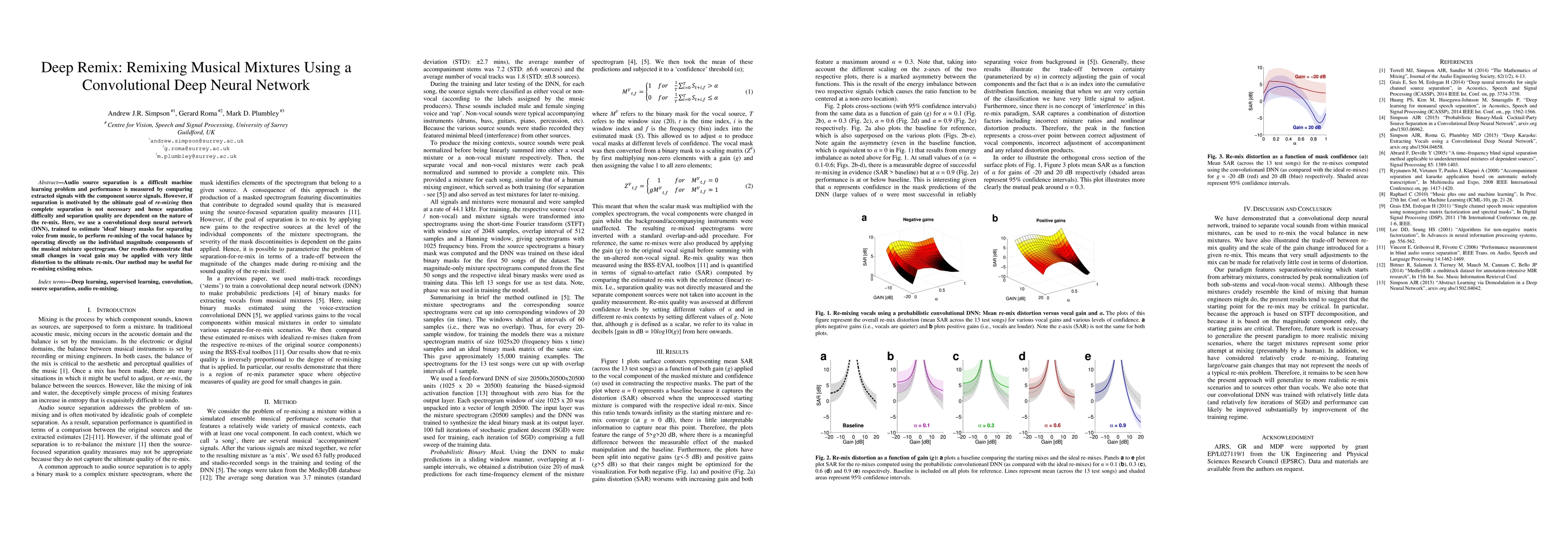 This paper uses a convolutional deep neural network to estimate binary masks for separating voice from music, enabling precise re-mixing of vocal balance with minimal distortion. The method shows potential for re-mixing existing audio mixes by directly manipulating the spectrogram's magnitude components.