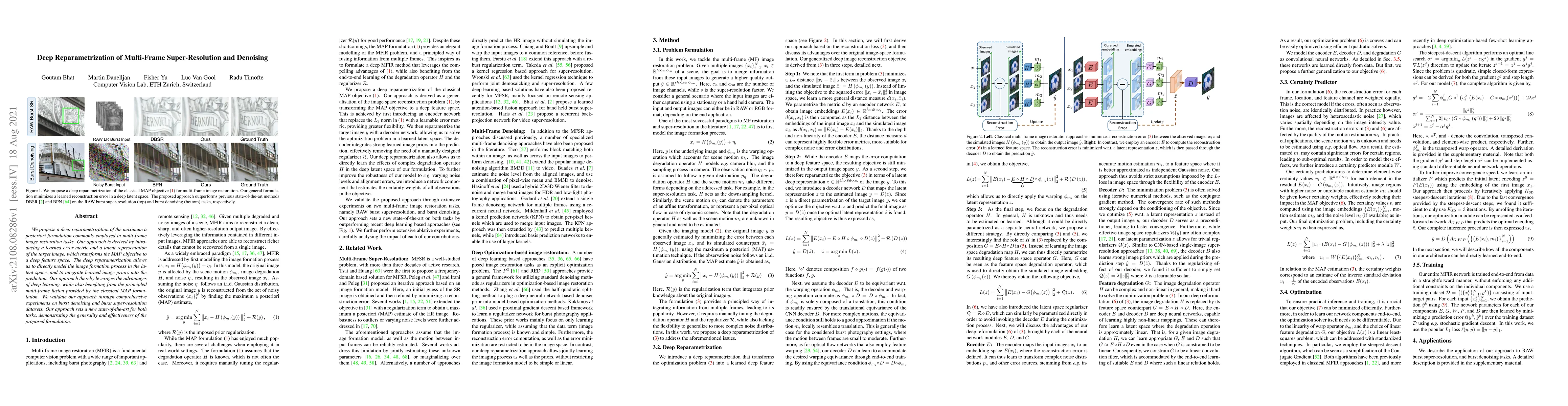 This paper proposes a deep reparametrization of the maximum a posteriori (MAP) formulation for multi-frame image restoration, integrating deep learning with classical MAP principles to enhance denoising and super-resolution. The new approach sets state-of-the-art results in both tasks.