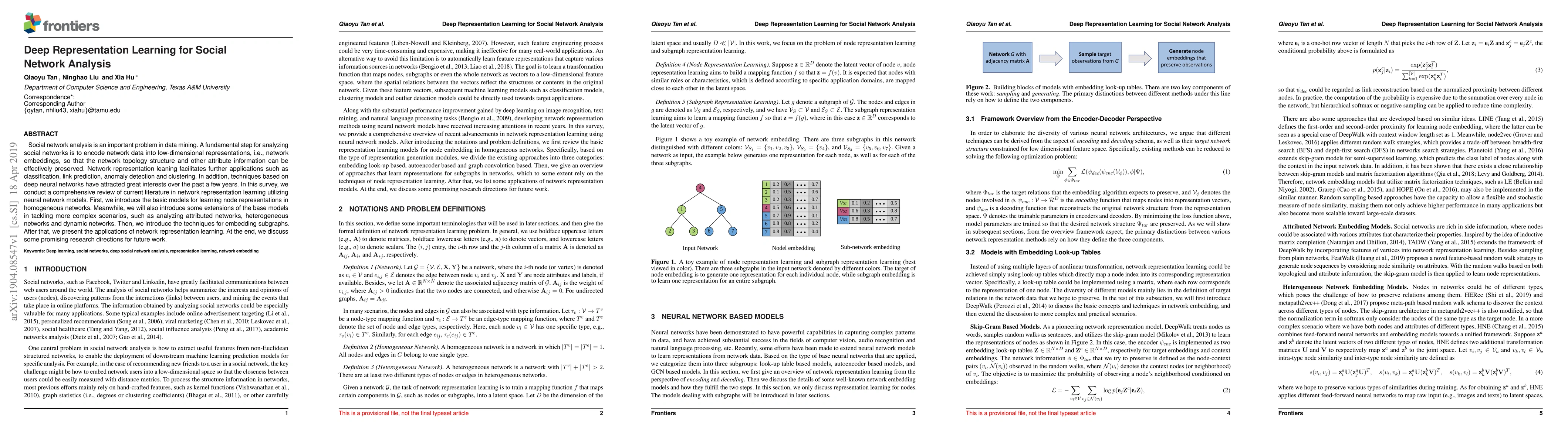 This paper surveys deep representation learning techniques for social network analysis, focusing on neural network models for encoding network data into low-dimensional embeddings. It covers basic models for homogeneous networks and extensions for attributed, heterogeneous, and dynamic networks, along with applications and future research directions.