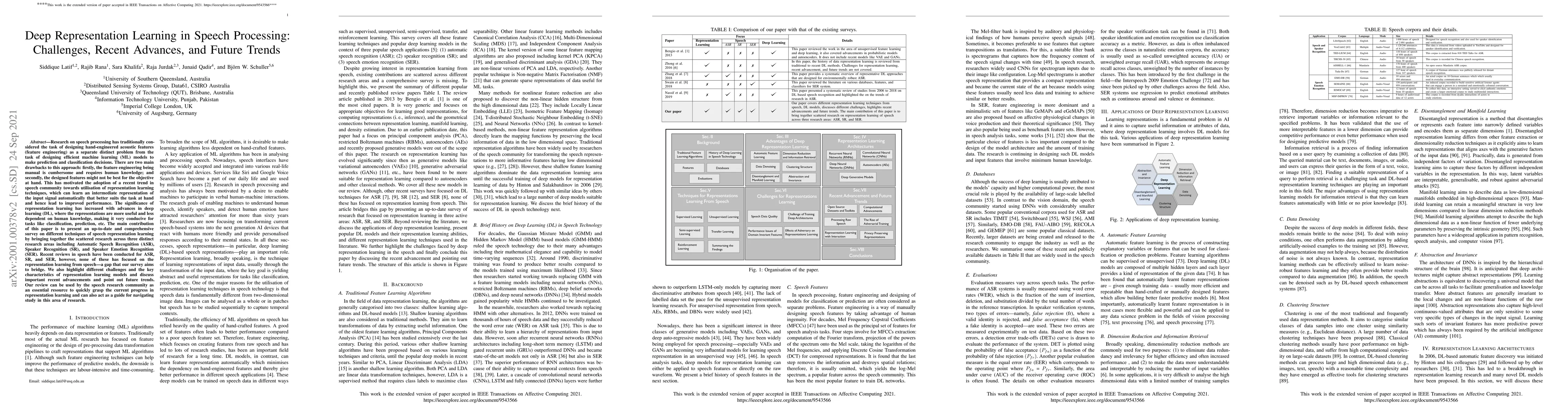 This paper surveys recent advances in deep representation learning for speech processing, highlighting its benefits over traditional feature engineering. It focuses on techniques that improve performance in Automatic Speech Recognition, Speaker Recognition, and Speaker Emotion Recognition by automatically learning useful signal representations, thus bridging a gap in existing literature focused on representation learning.