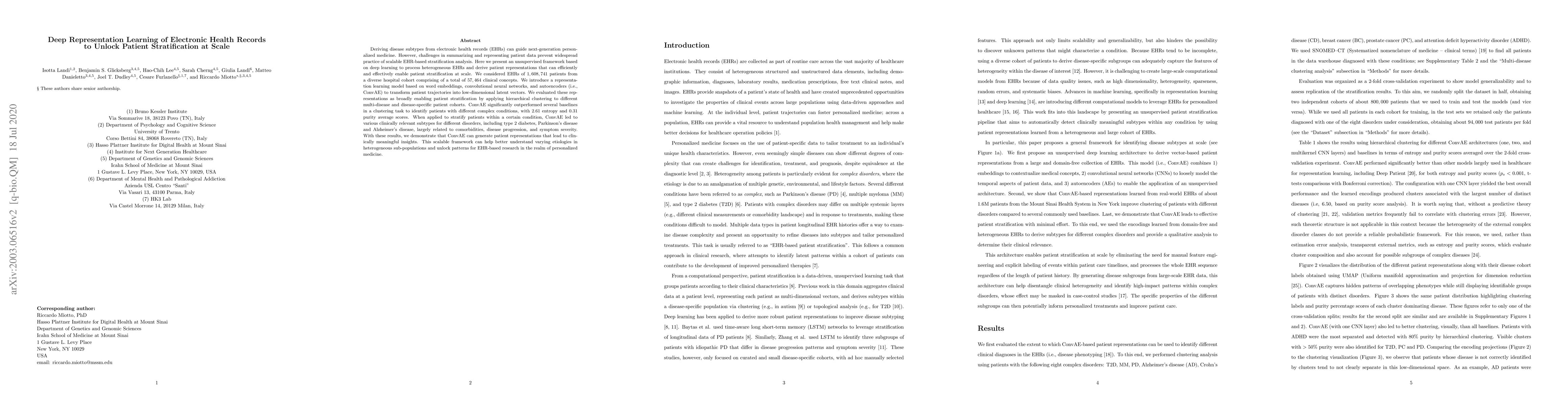 This paper proposes an unsupervised deep learning framework, ConvAE, to transform electronic health records into low-dimensional representations, enabling effective patient stratification at scale. The ConvAE model outperformed baselines in clustering patients with complex conditions, revealing clinically relevant subtypes in disorders like type 2 diabetes and Alzheimer's disease, thereby offering scalable insights for personalized medicine.