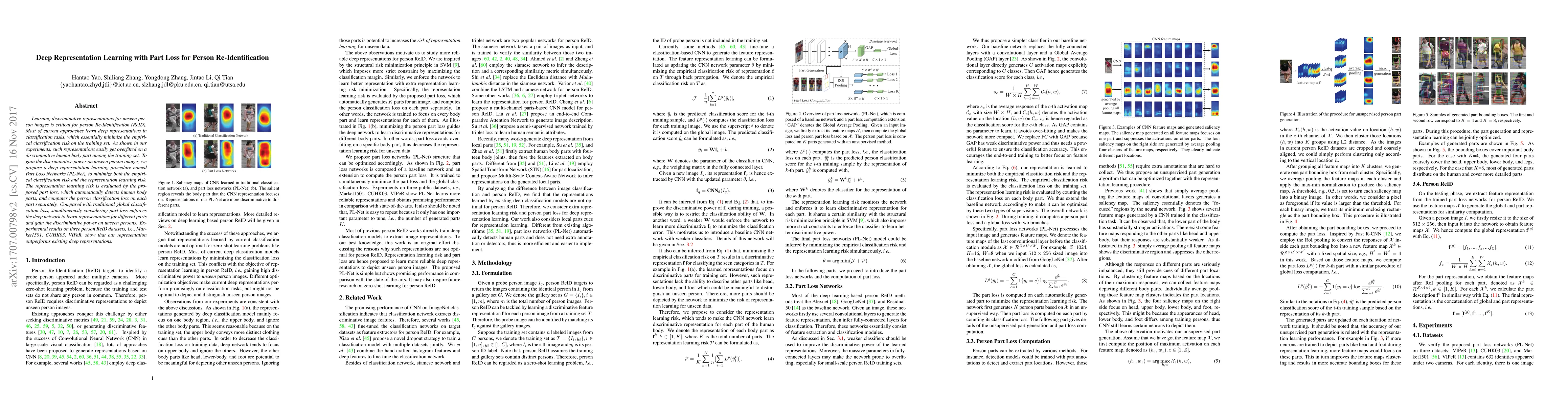 This paper proposes a method to learn discriminative deep representations for person re-identification by minimizing both classification and part loss risks. The part loss focuses the network on learning from the entire human body rather than just discriminative parts, leading to improved performance on multiple datasets.