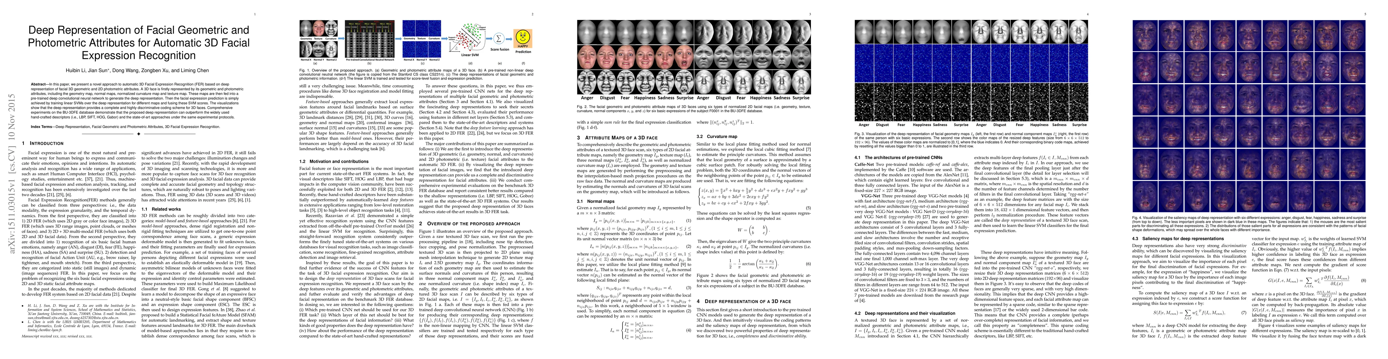 This paper proposes a novel approach for automatic 3D Facial Expression Recognition using deep representation of facial geometric and photometric attributes. The method outperforms traditional hand-crafted descriptors and state-of-the-art approaches, as demonstrated through experiments on the BU-3DFE database.