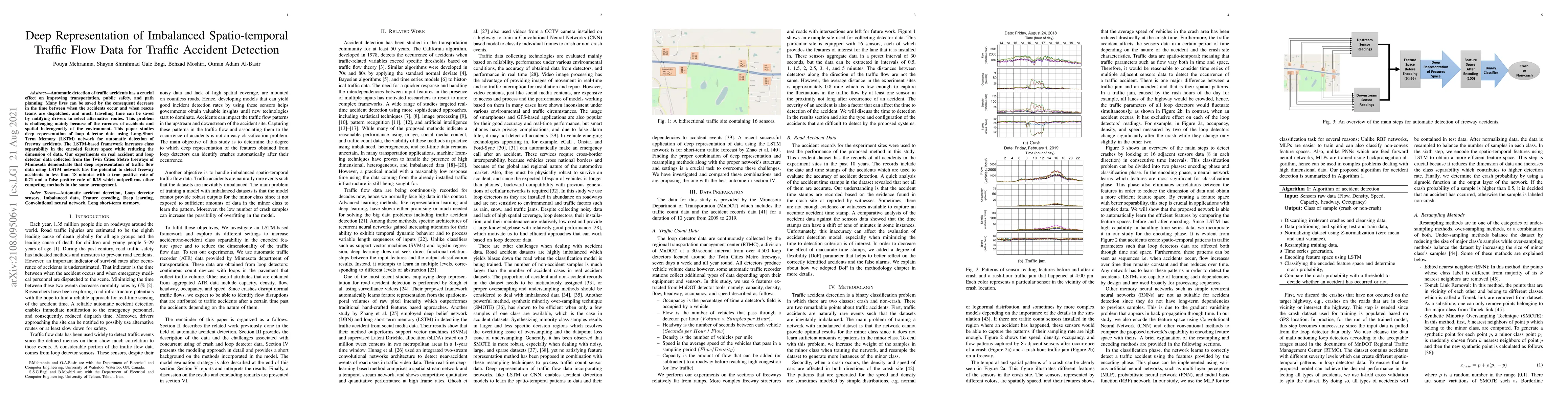This paper proposes a deep representation using Long-Short Term Memory (LSTM) networks to detect traffic accidents automatically, addressing the imbalance and spatial heterogeneity of traffic flow data. Experiments on real data from Minnesota freeways show the LSTM-based method can detect accidents within 18 minutes with a true positive rate of 0.71 and a false positive rate of 0.25, outperforming other methods.