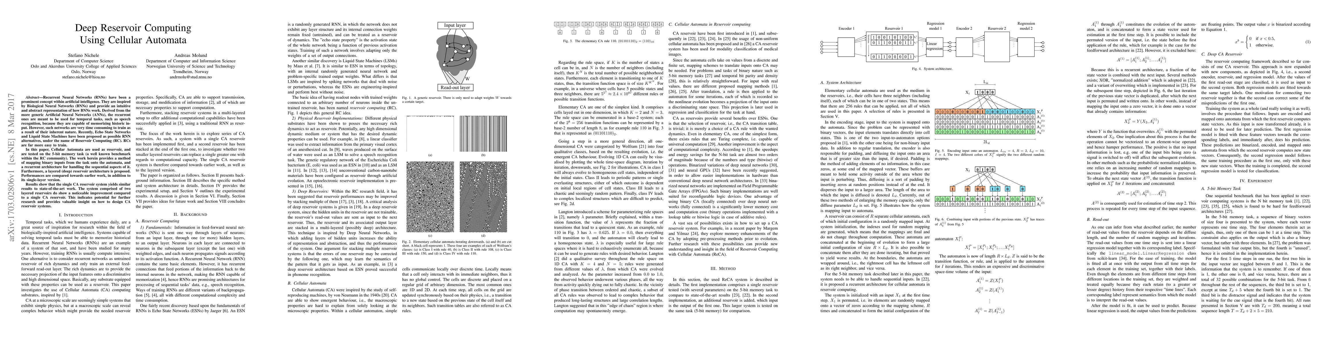 Recurrent Neural Networks (RNNs) have been a prominent concept within artificial intelligence. They are inspired by Biological Neural Networks (BNNs) and provide an intuitive and abstract representation of how BNNs work. Derived from the more generic Artificial Neural Networks (ANNs), the recurrent ones are meant to be used for temporal tasks, such as speech recognition, because they are capable of memorizing historic input. However, such networks are very time consuming to train as a result of their inherent nature. Recently, Echo State Networks and Liquid State Machines have been proposed as possible RNN alternatives, under the name of Reservoir Computing (RC). RCs are far more easy to train. In this paper, Cellular Automata are used as reservoir, and are tested on the 5-bit memory task (a well known benchmark within the RC community). The work herein provides a method of mapping binary inputs from the task onto the automata, and a recurrent architecture for handling the sequential aspects of it. Furthermore, a layered (deep) reservoir architecture is proposed. Performances are compared towards earlier work, in addition to its single-layer version. Results show that the single CA reservoir system yields similar results to state-of-the-art work. The system comprised of two layered reservoirs do show a noticeable improvement compared to a single CA reservoir. This indicates potential for further research and provides valuable insight on how to design CA reservoir systems.