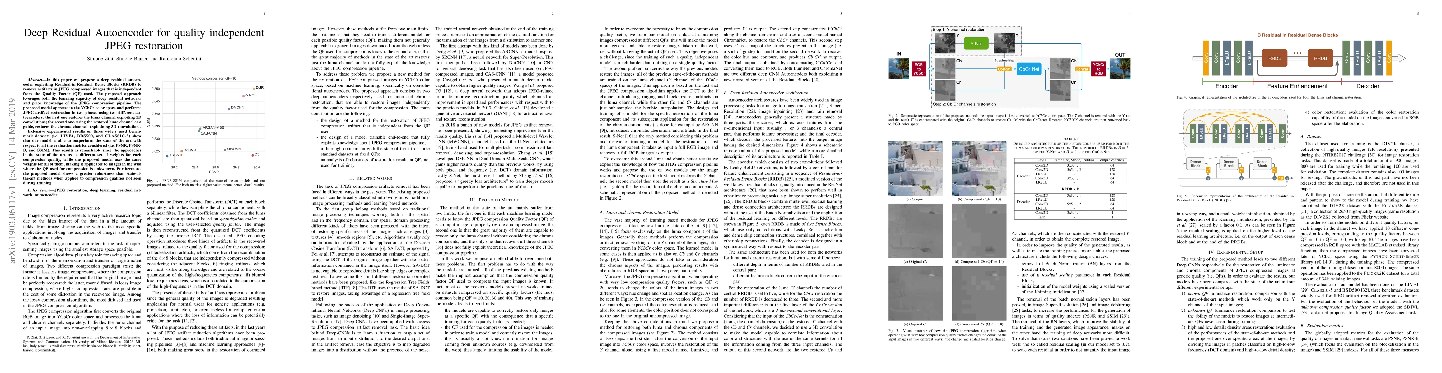 This paper introduces a deep residual autoencoder with Residual-in-Residual Dense Blocks to effectively remove JPEG compression artifacts independently of the Quality Factor used. It outperforms state-of-the-art methods on various metrics while maintaining consistent performance across different compression qualities.