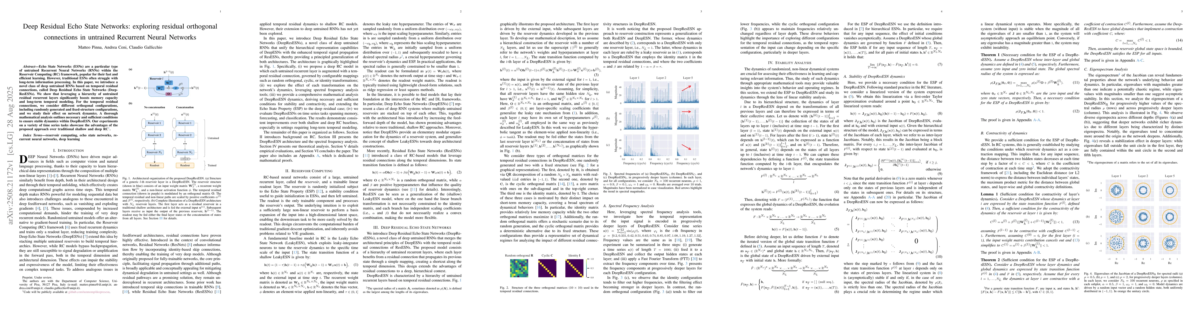 Echo State Networks (ESNs) are a particular type of untrained Recurrent Neural Networks (RNNs) within the Reservoir Computing (RC) framework, popular for their fast and efficient learning. However, traditional ESNs often struggle with long-term information processing. In this paper, we introduce a novel class of deep untrained RNNs based on temporal residual connections, called Deep Residual Echo State Networks (DeepResESNs). We show that leveraging a hierarchy of untrained residual recurrent layers significantly boosts memory capacity and long-term temporal modeling. For the temporal residual connections, we consider different orthogonal configurations, including randomly generated and fixed-structure configurations, and we study their effect on network dynamics. A thorough mathematical analysis outlines necessary and sufficient conditions to ensure stable dynamics within DeepResESN. Our experiments on a variety of time series tasks showcase the advantages of the proposed approach over traditional shallow and deep RC.